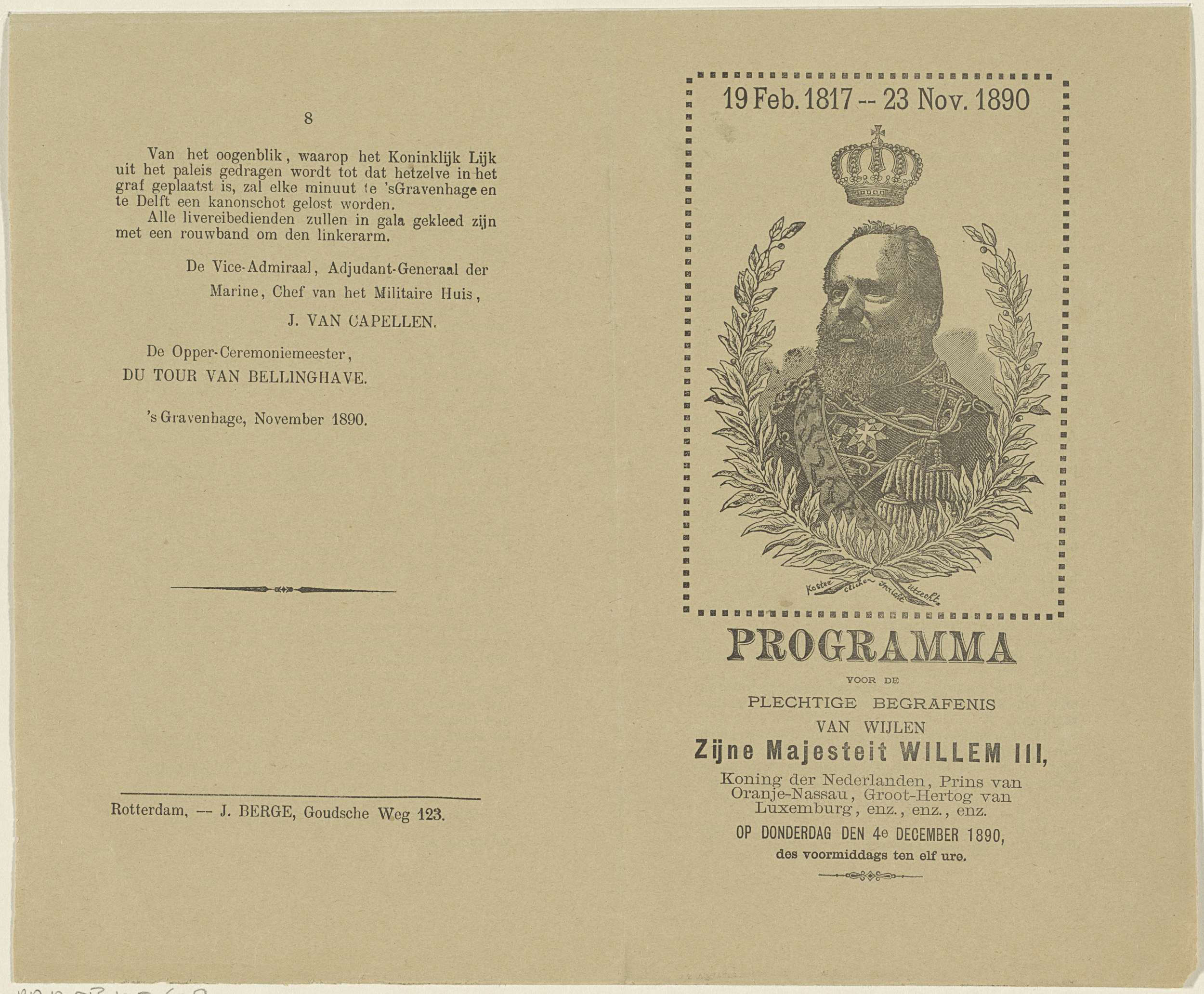 Programma van de begrafenis van Willem III, koning d...