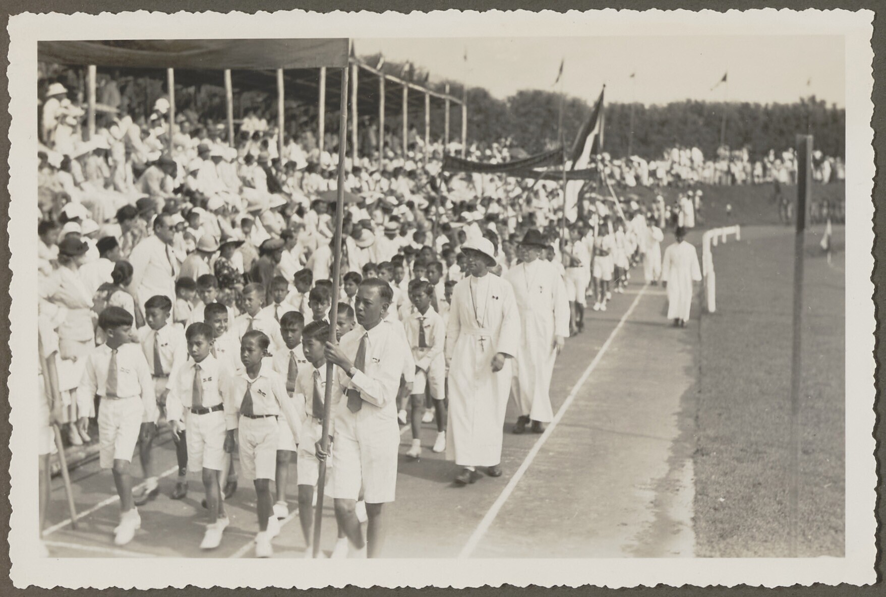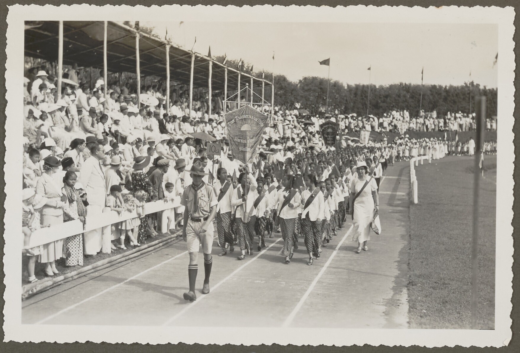 Schooljongens paraderen op de Oranjefeesten in Malang