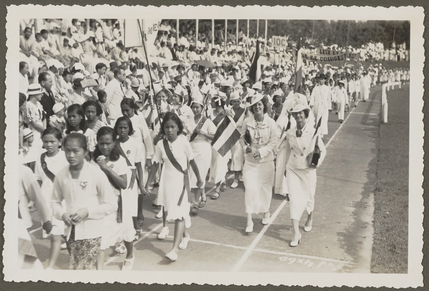 Schoolmeisjes paraderen op de Oranjefeesten in Malang