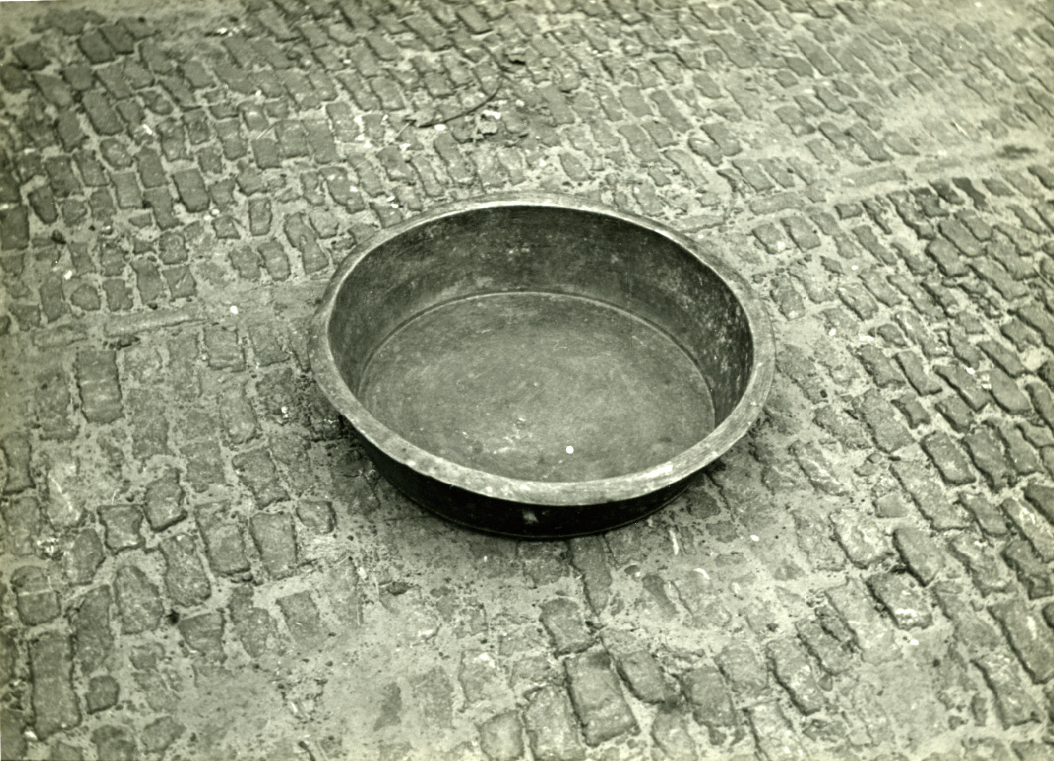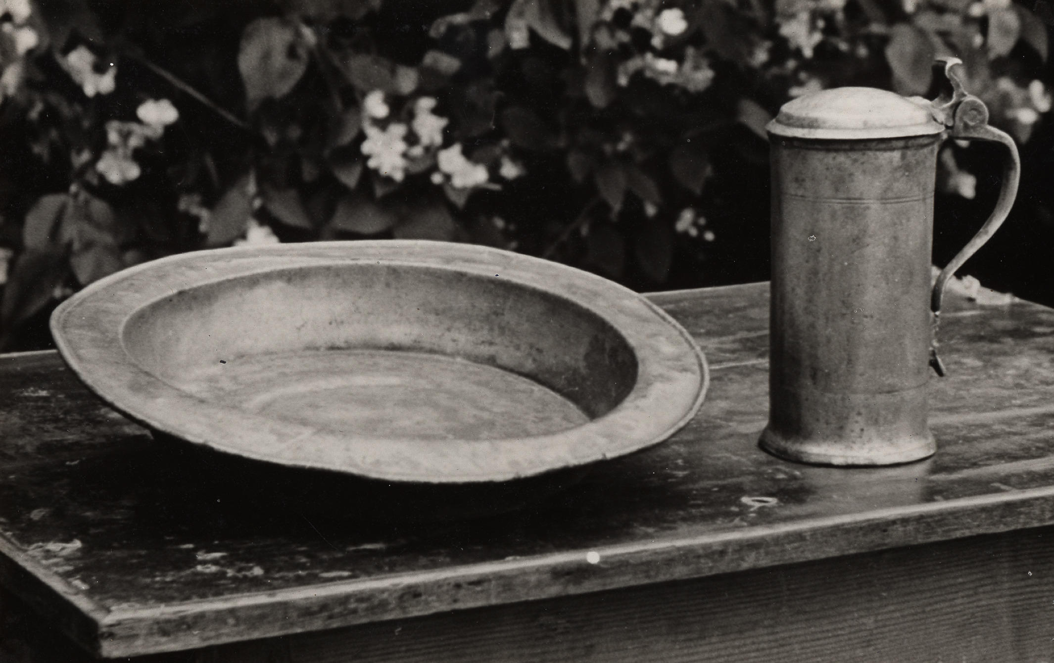 Tinnen schaal en kan, Staphorst, 1950 (zwart-wit foto)