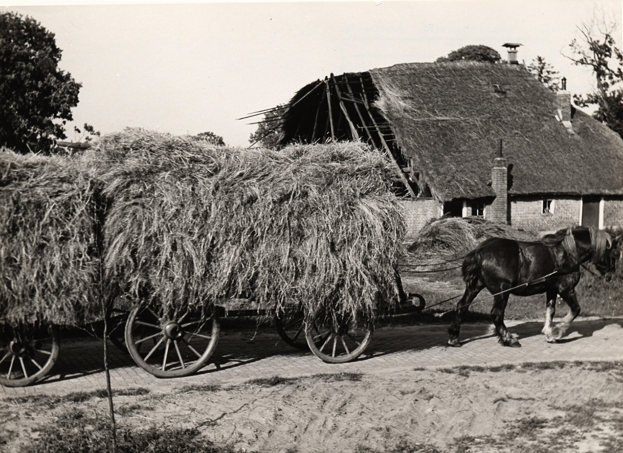 Geladen hooiwagens, Staphorst, 1950 (zwart-wit foto)