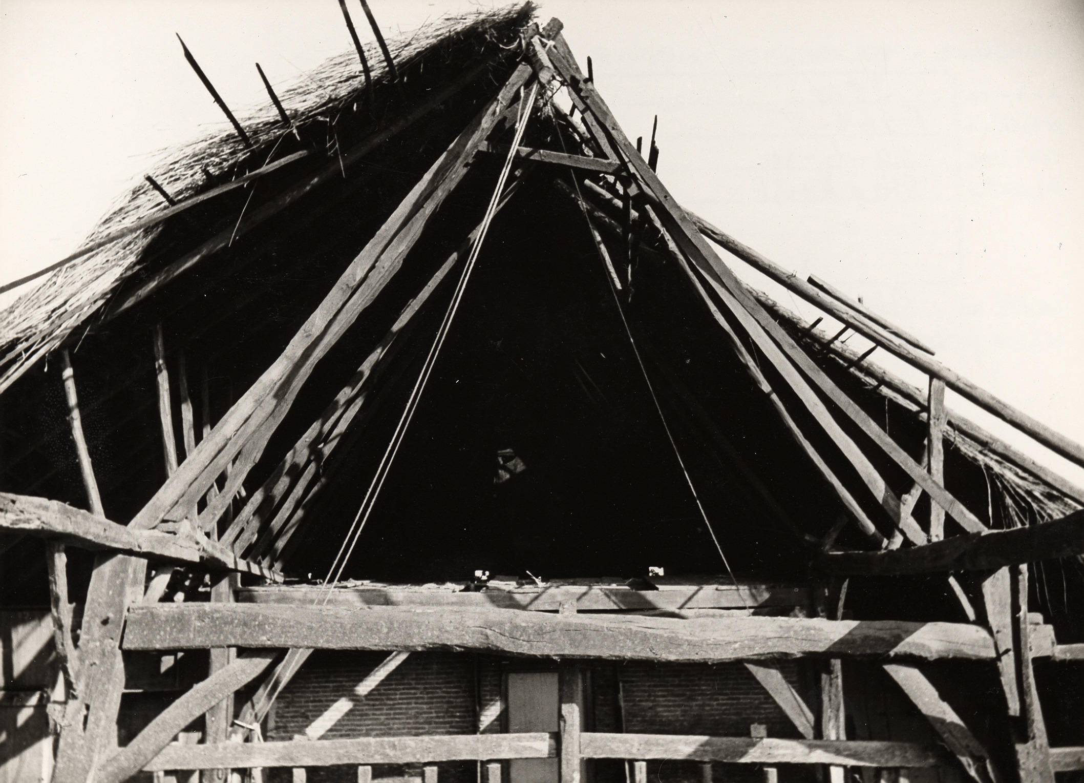 Afbraak van boerderij, Staphorst, 1950 (zwart-wit foto)
