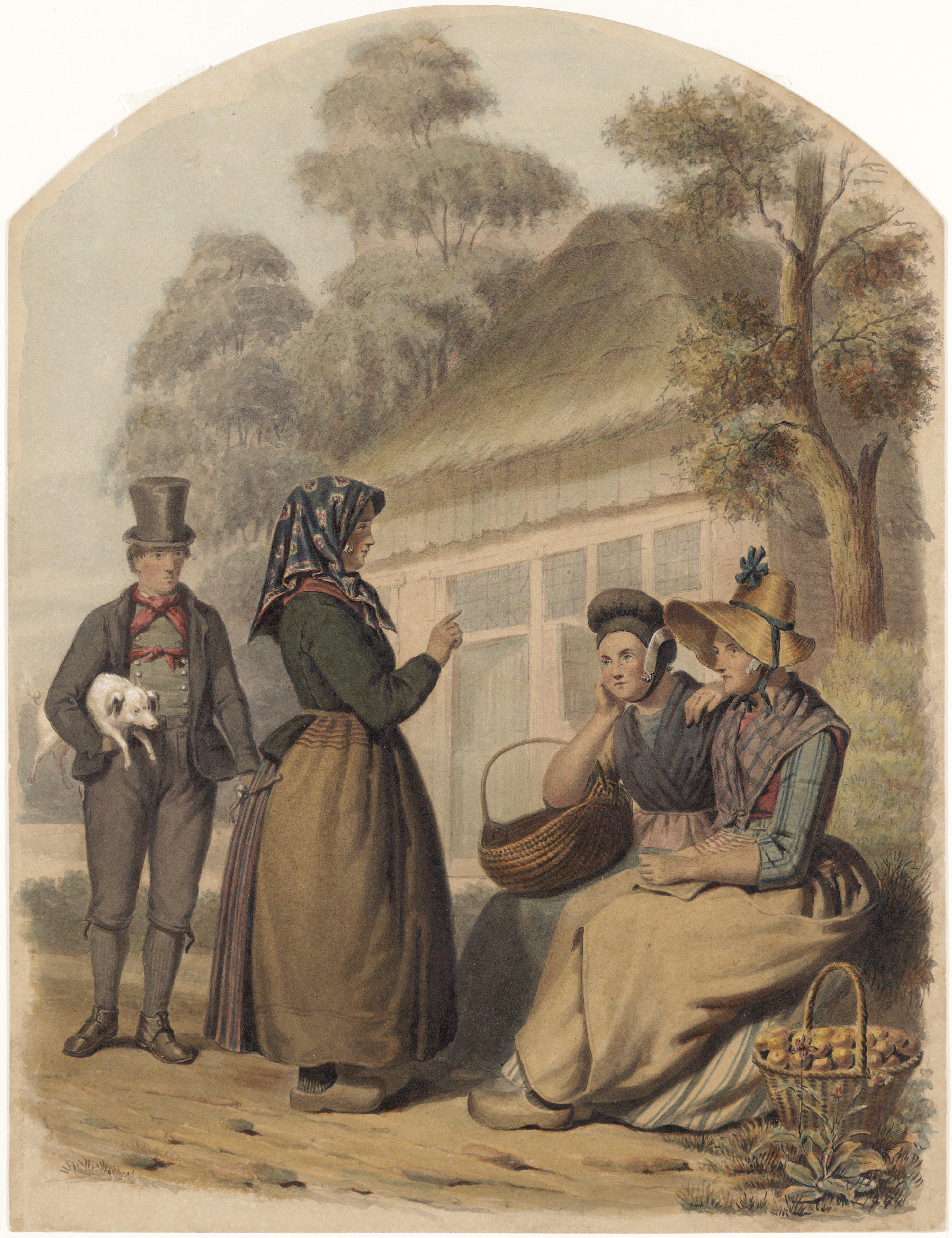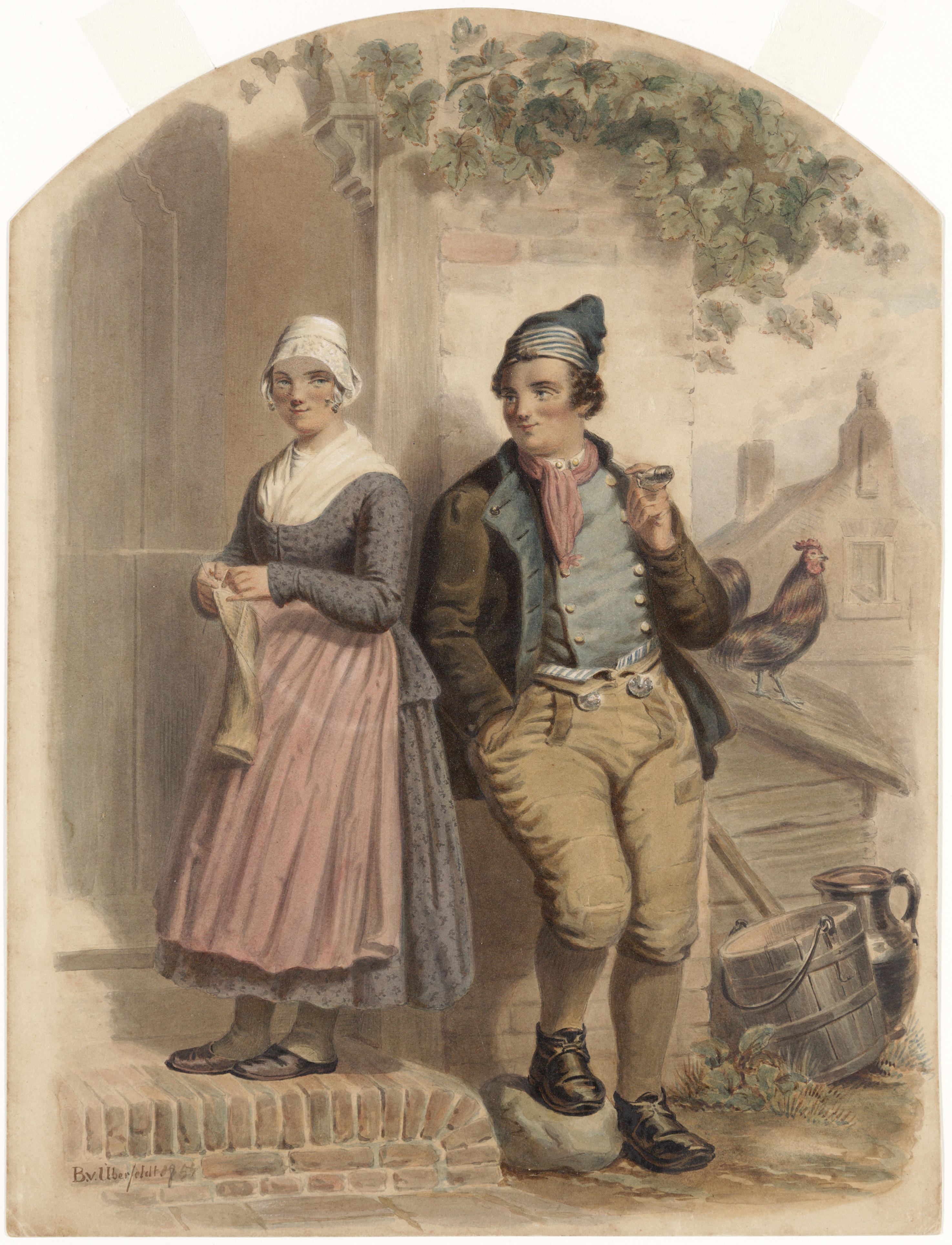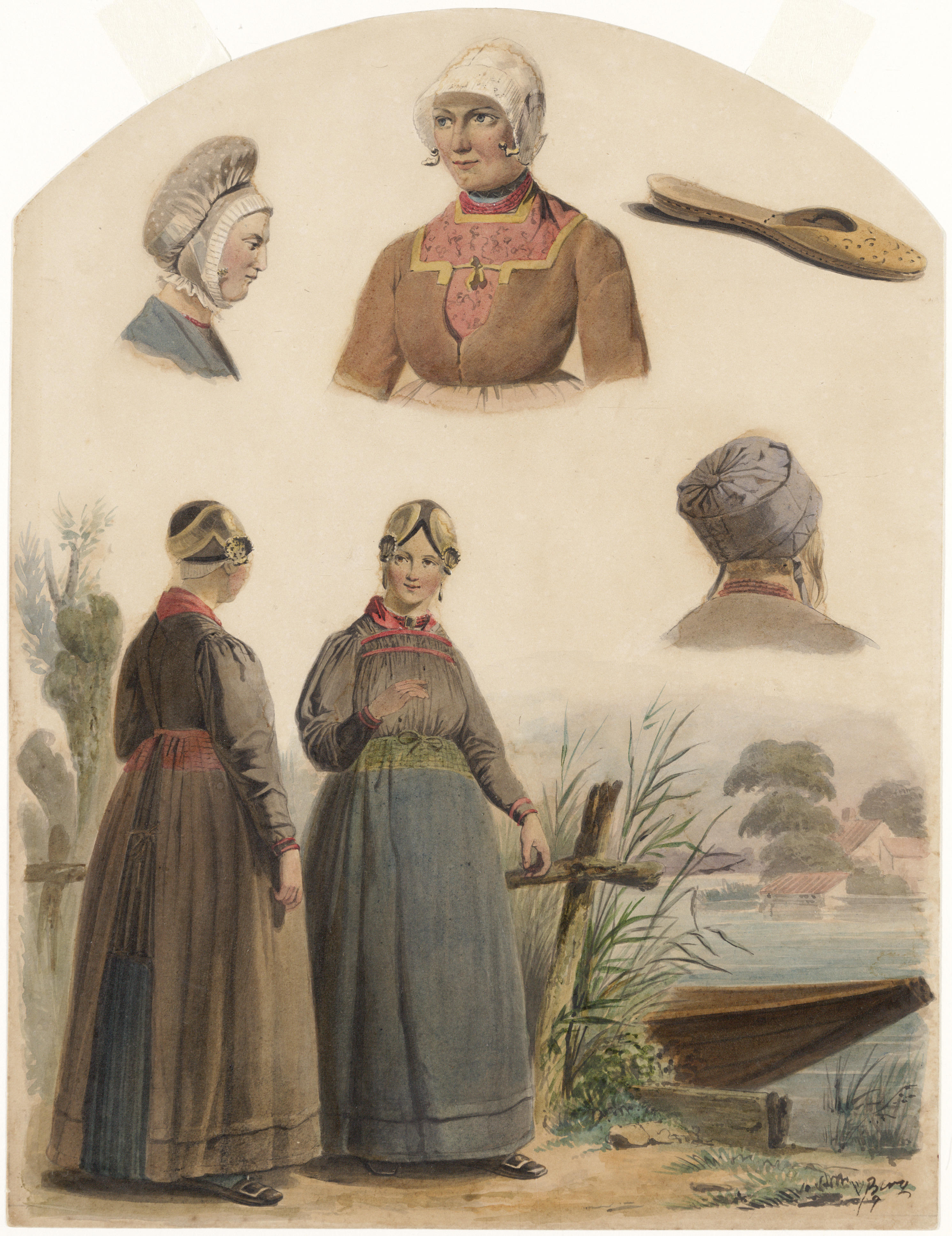 Gehuwde en ongehuwde vrouw in dracht van Hindeloopen