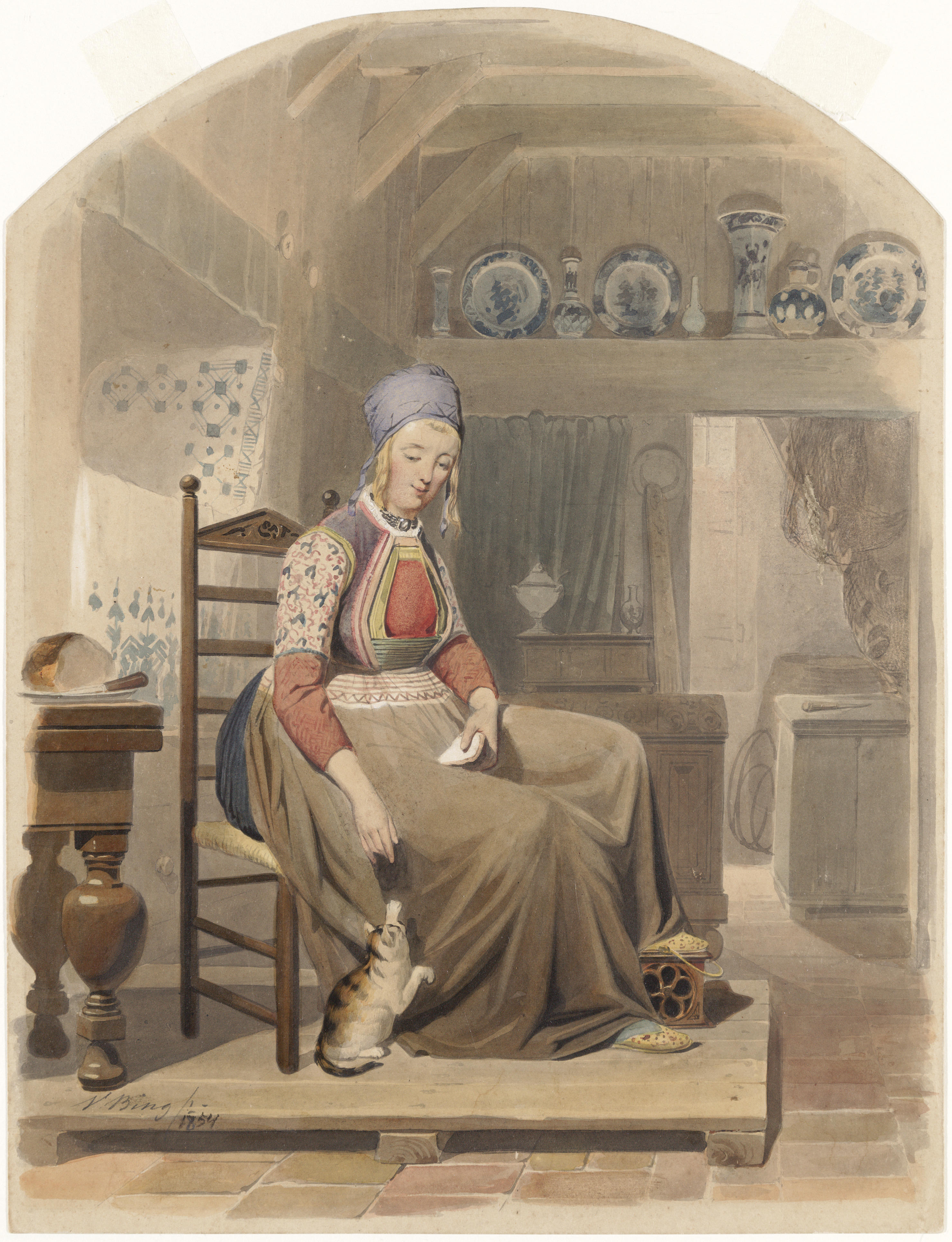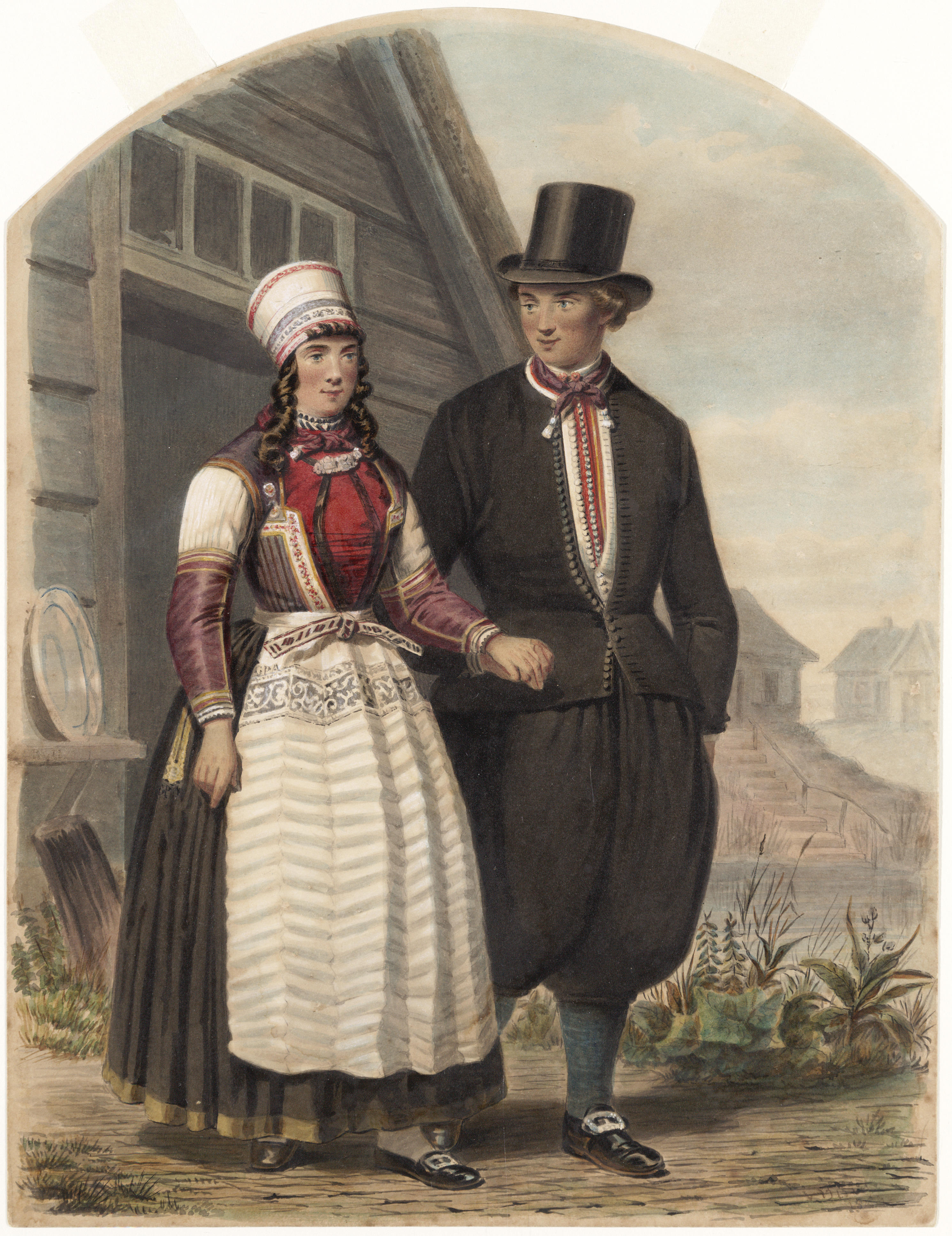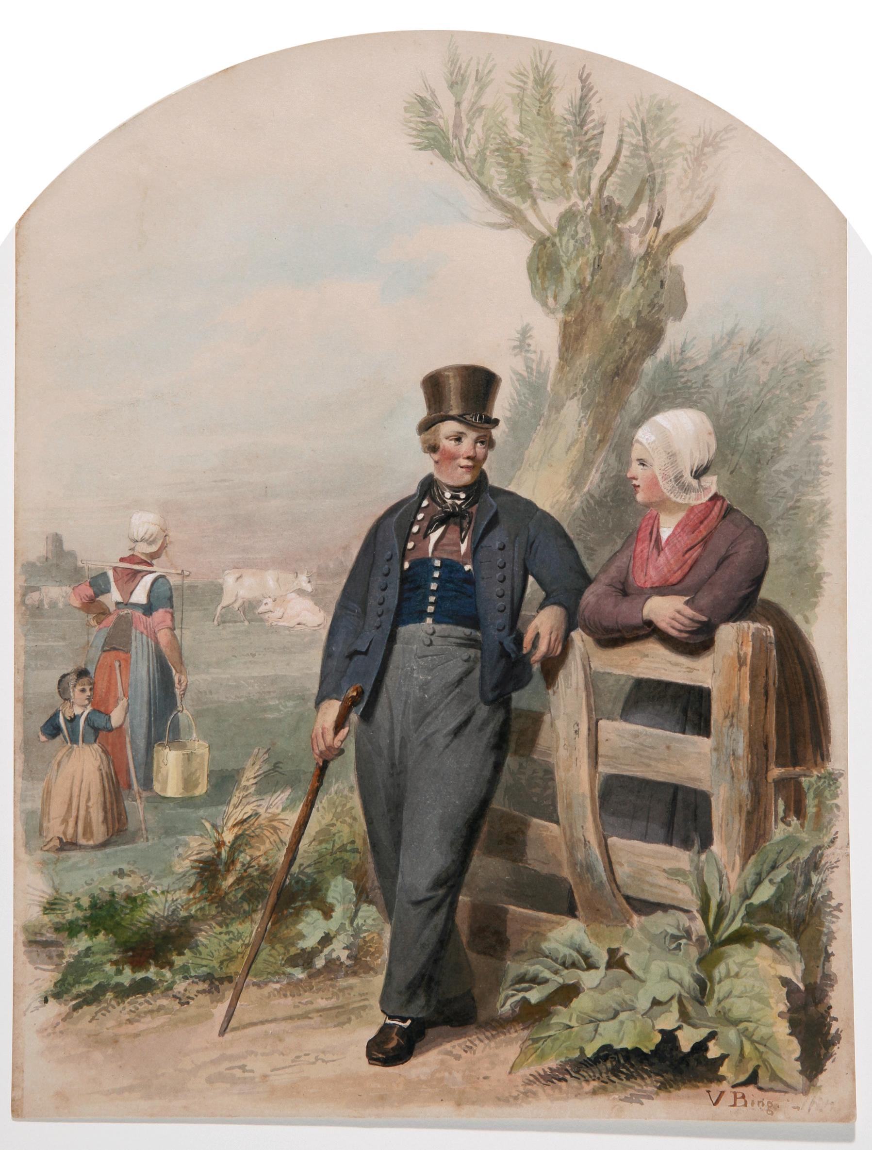 Gehuwde en ongehuwde vrouw in dracht van Hindeloopen