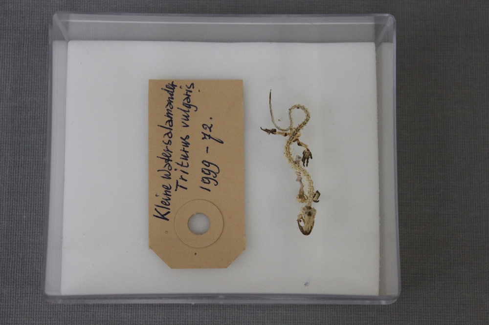 Kleine watersalamander; skelet; in doosje