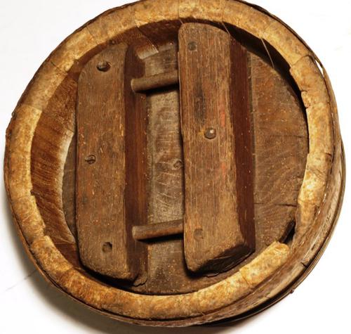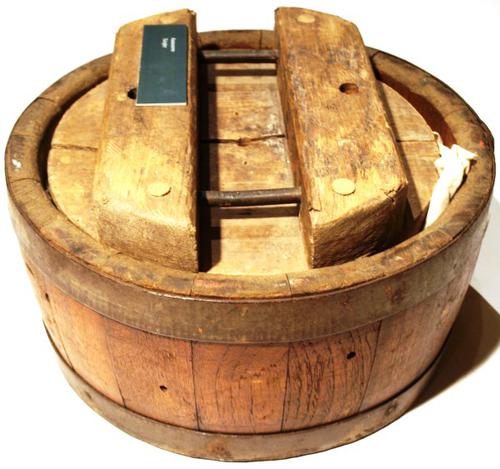 Kaaspers van hout gebruikt om wrongel in een kaasvat...
