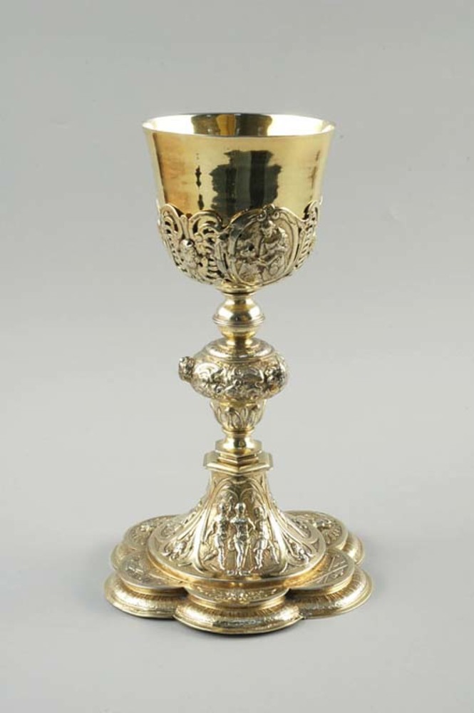 Met reliëfs versierde kelk op zeslobbige voet