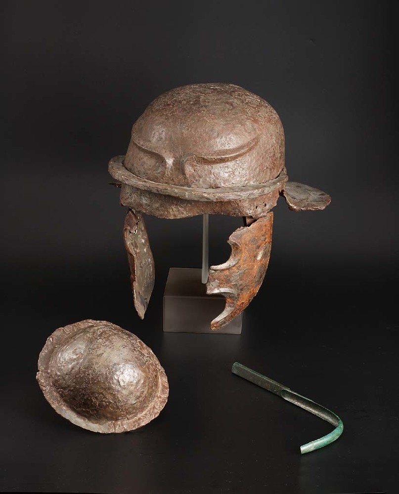 Helm, schildknop en huidschraper gevonden op Hunerbe...