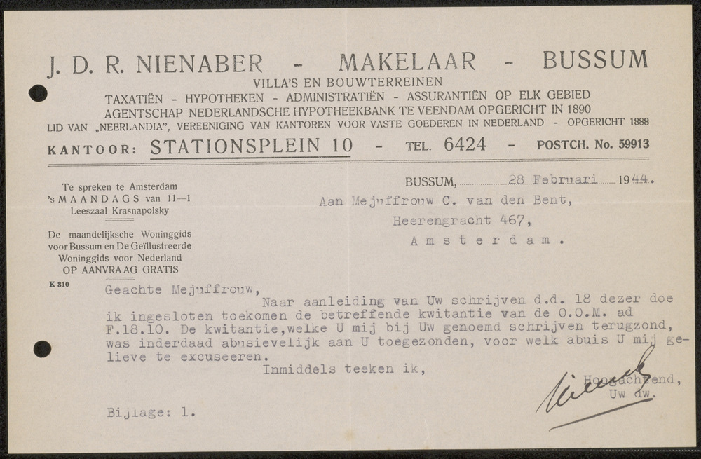 Rekening voor Mej. C. v.d. Bent te Amsterdam