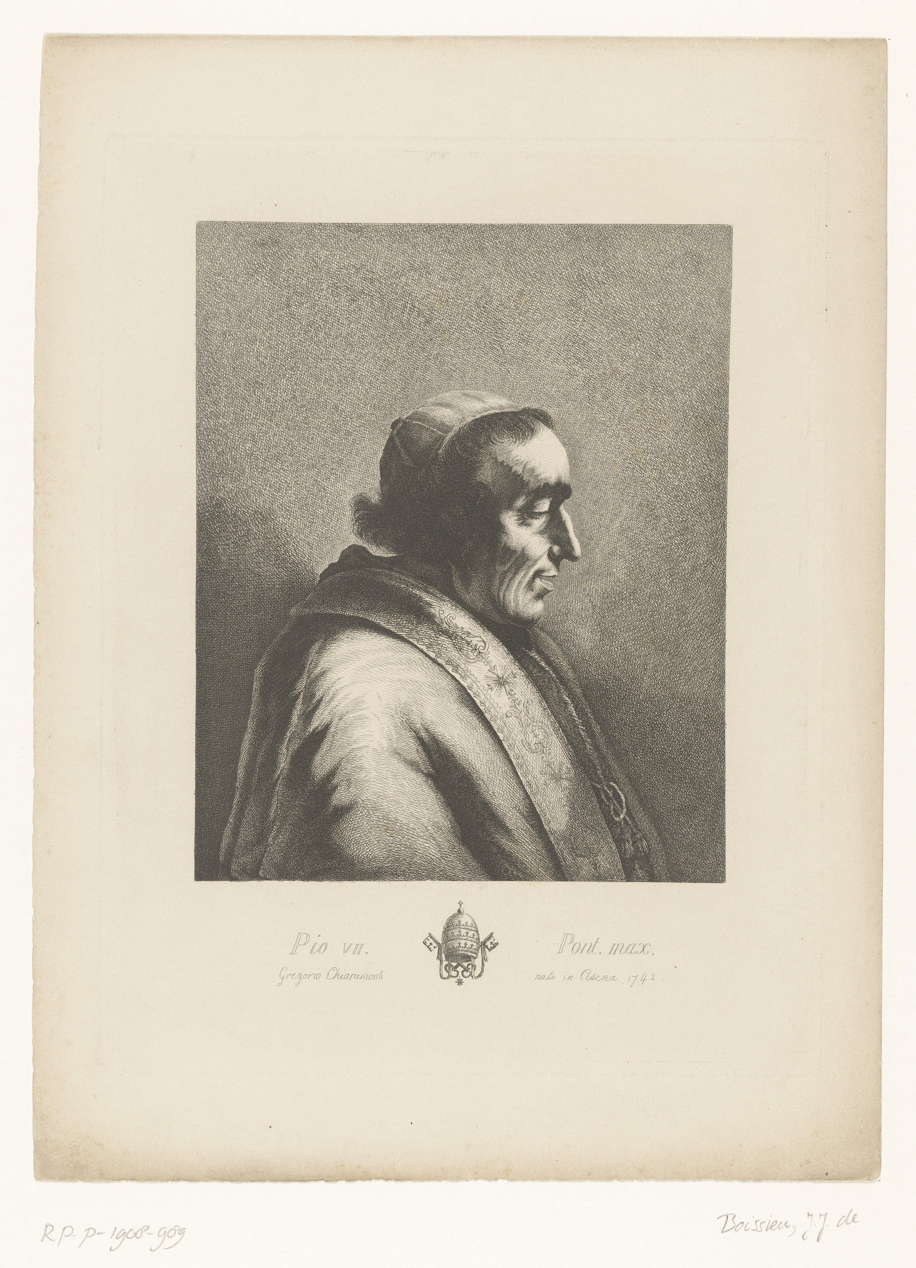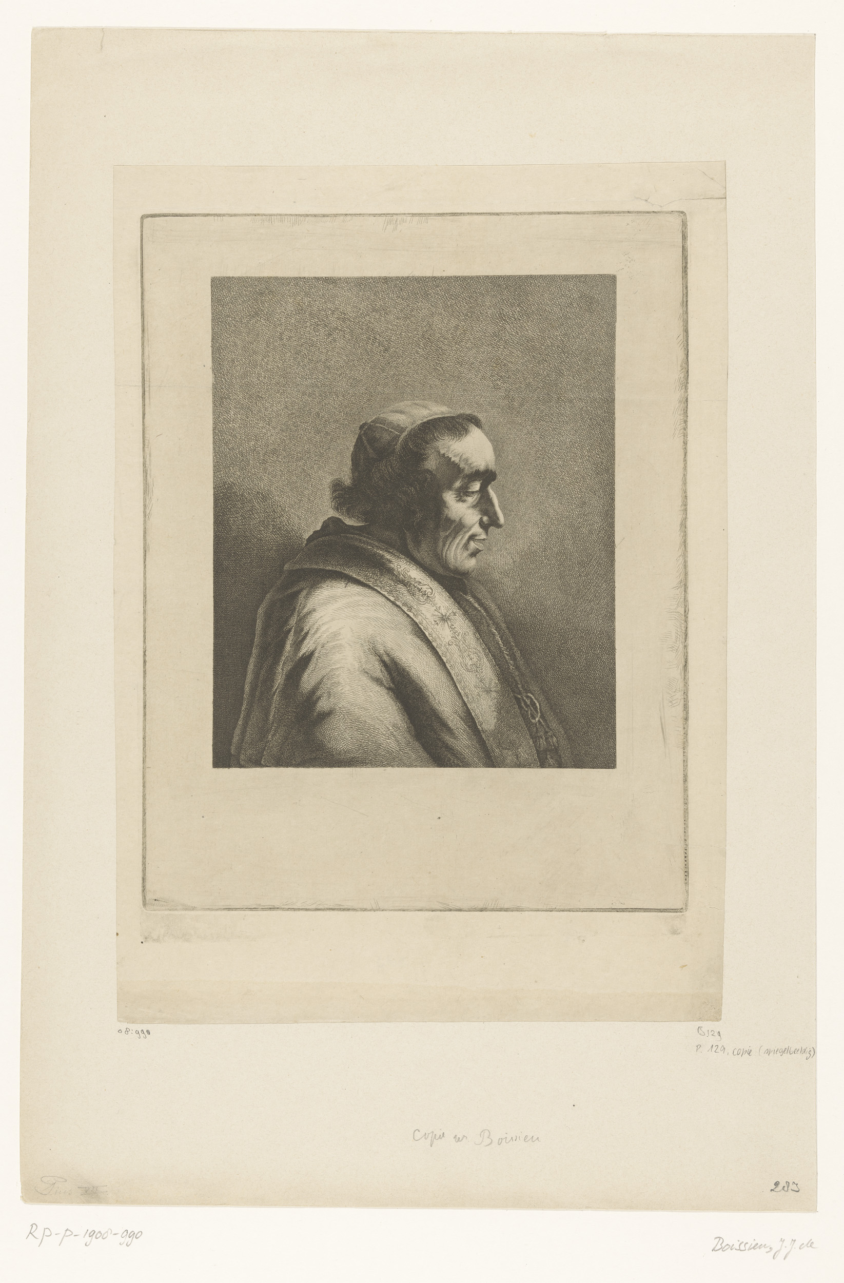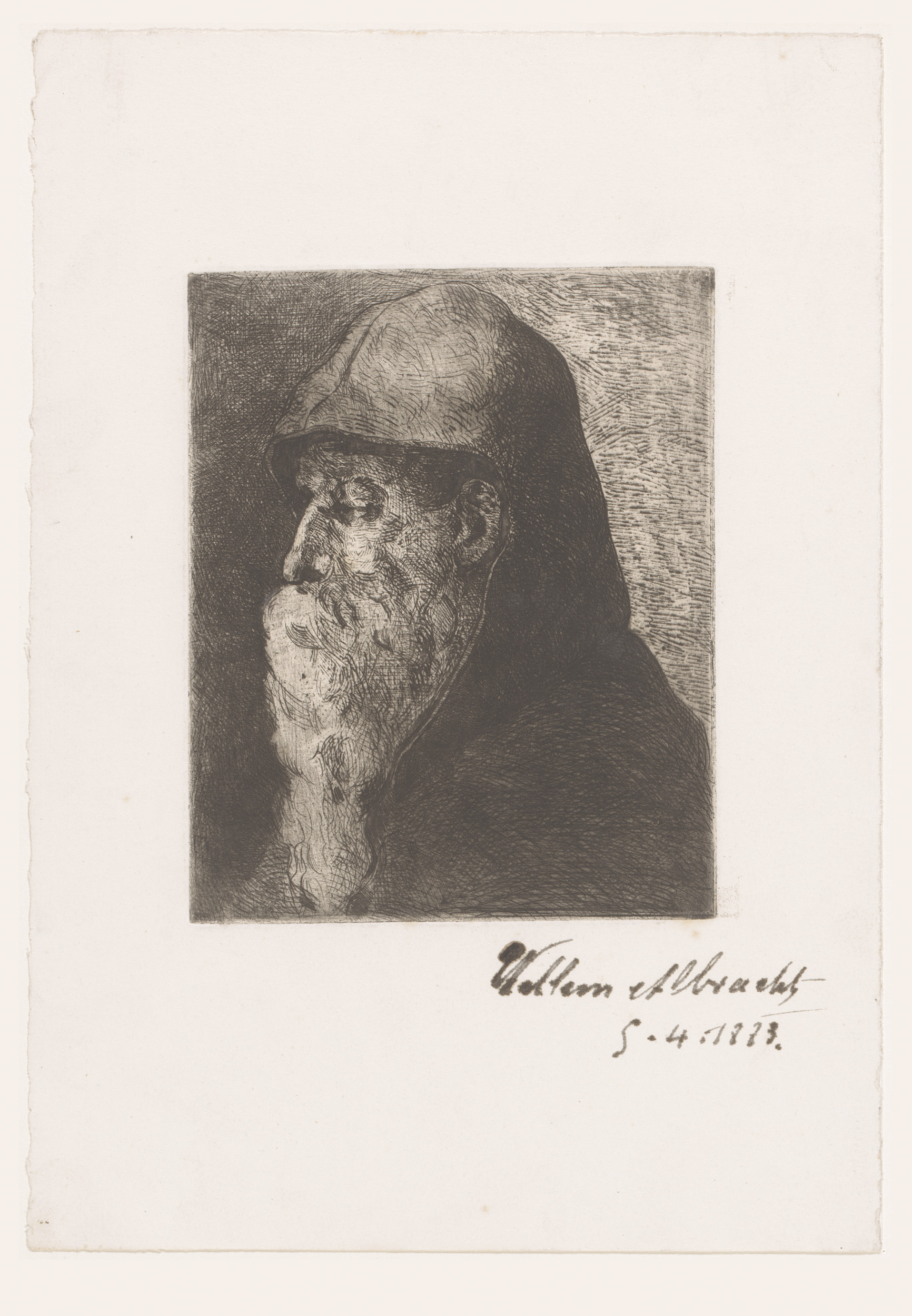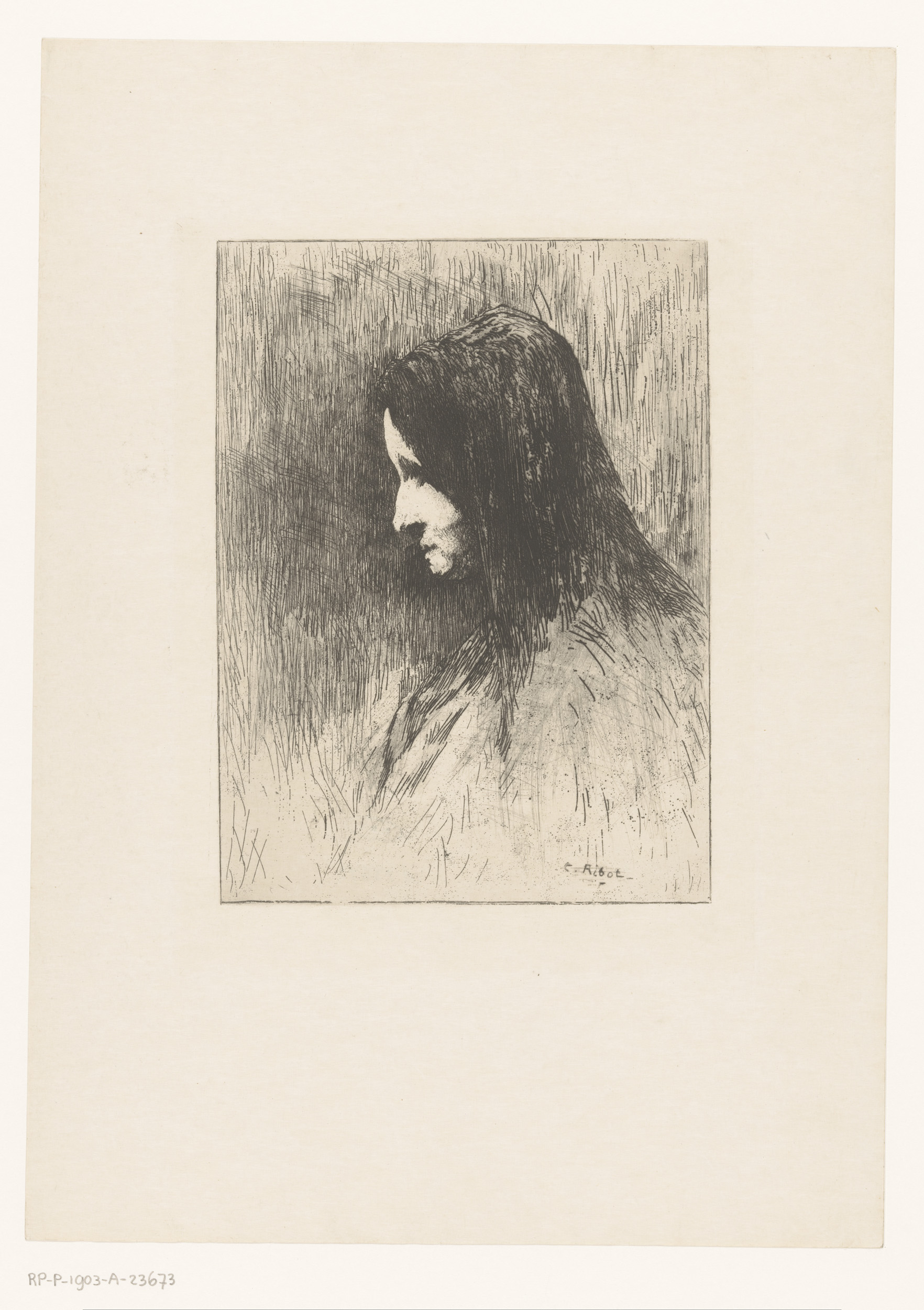 Buste van een oude vrouw met hoofddoek, van opzij ge...