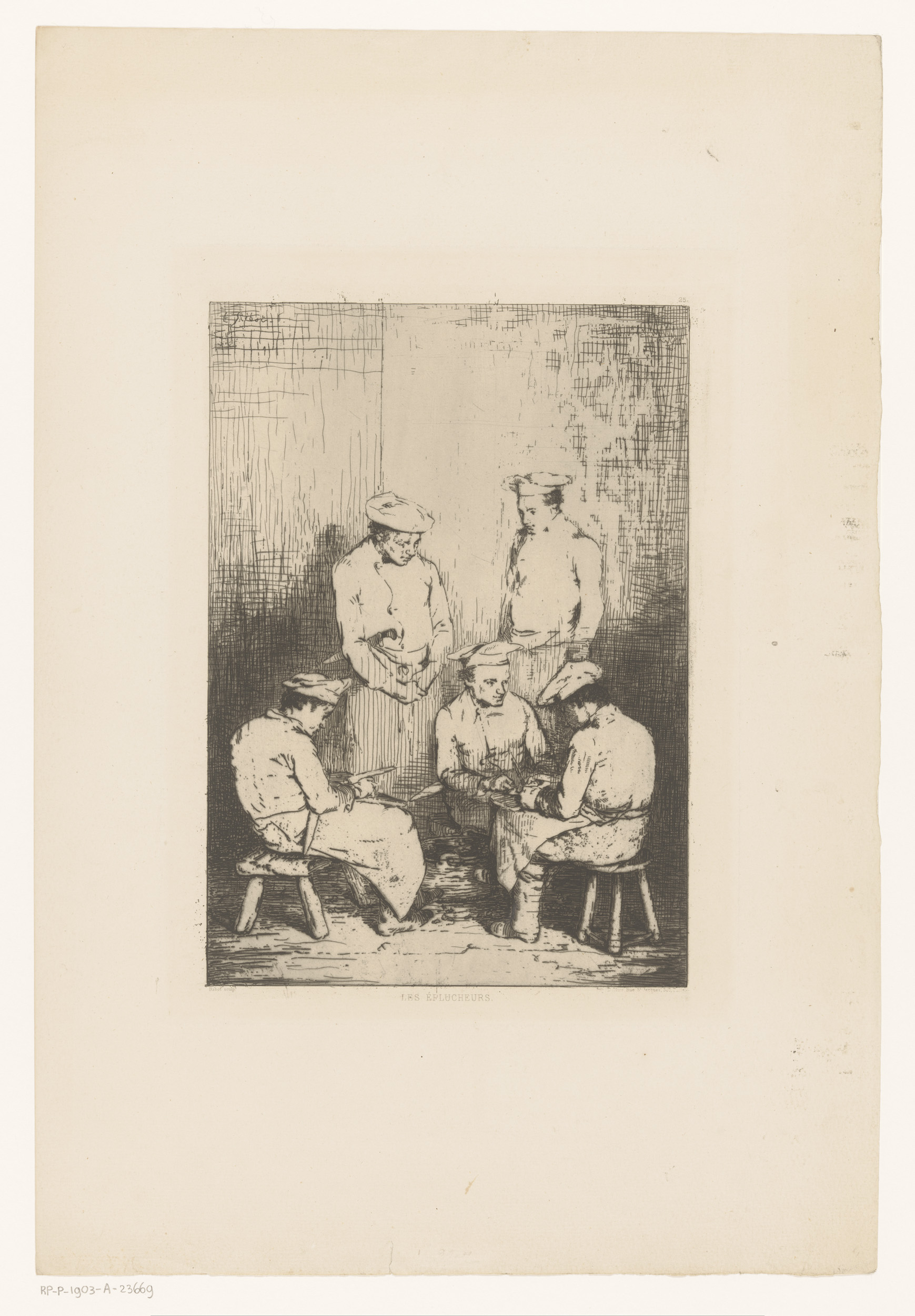 Groep van vijf koks, waarvan er drie zitten te schillen