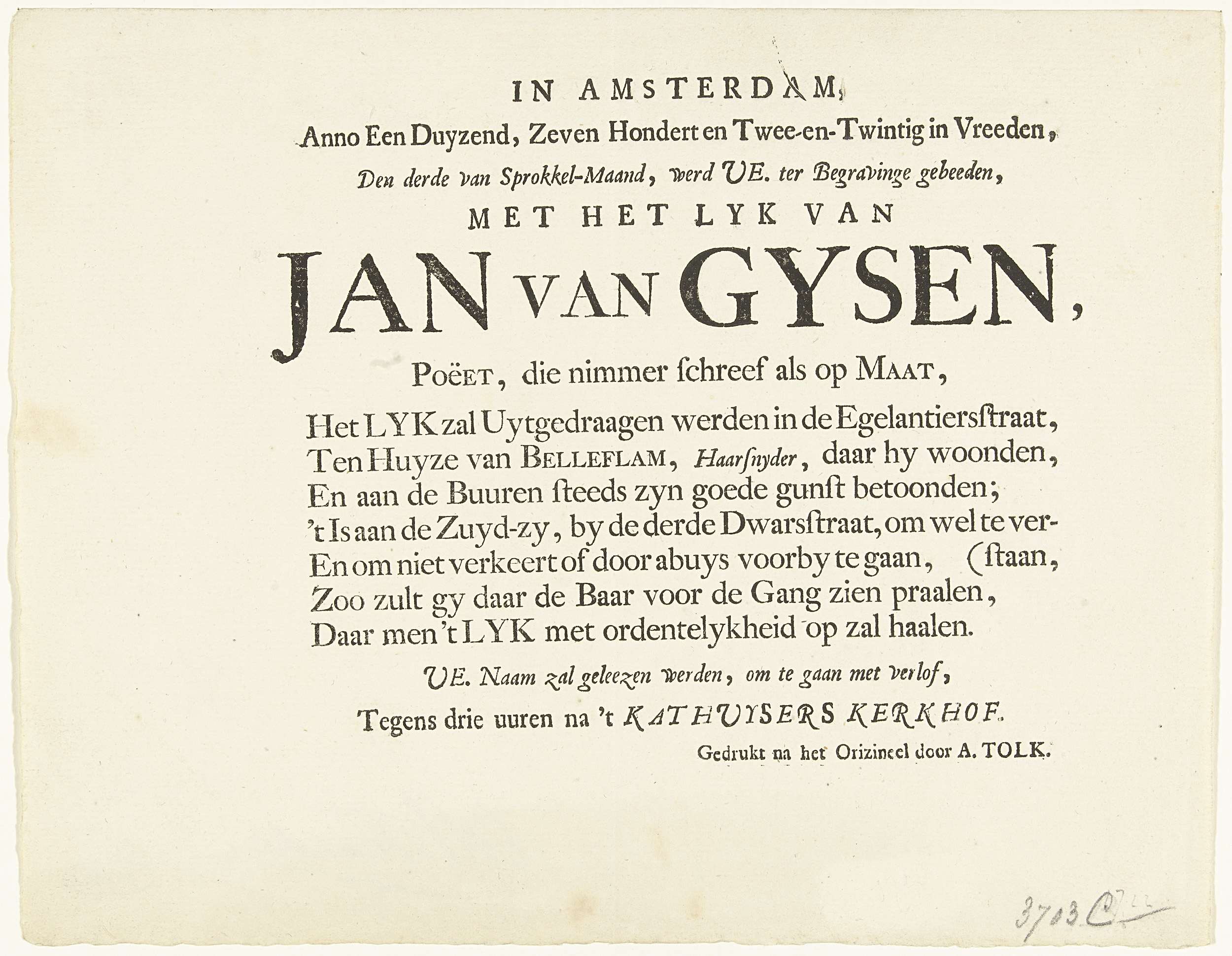 Uitnodiging voor de begrafenis van de dichter Jan va...