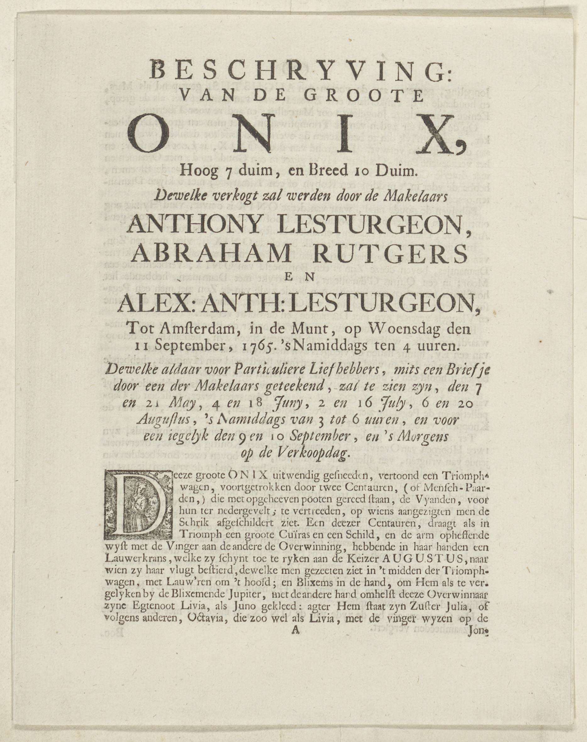 Tekstblad bij de prent van de onyx met een Romeinse ...