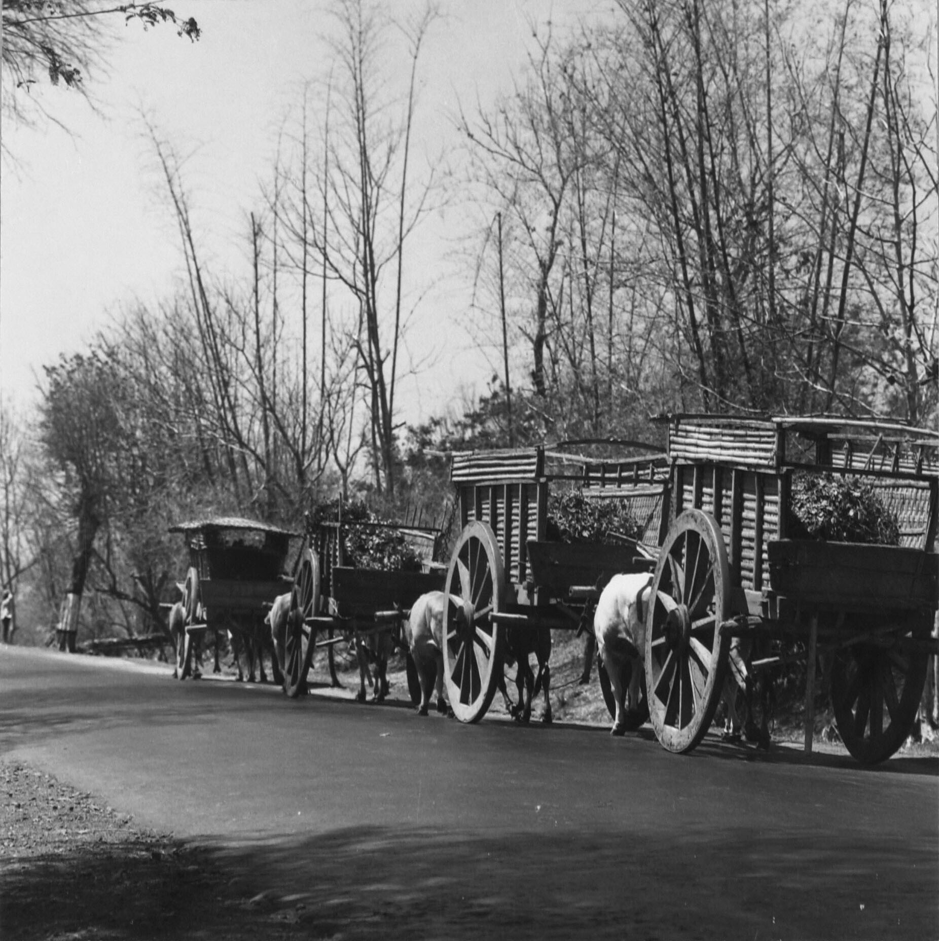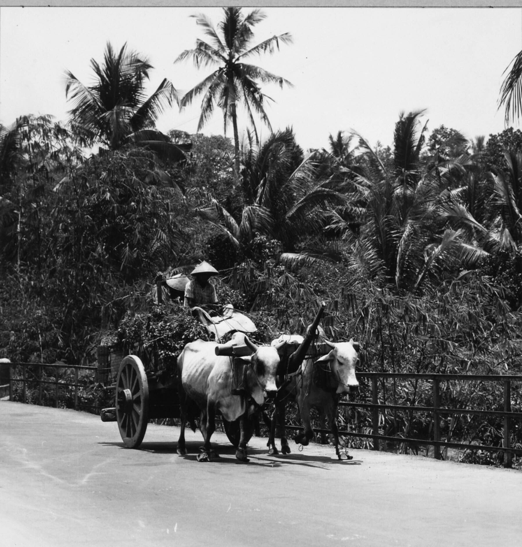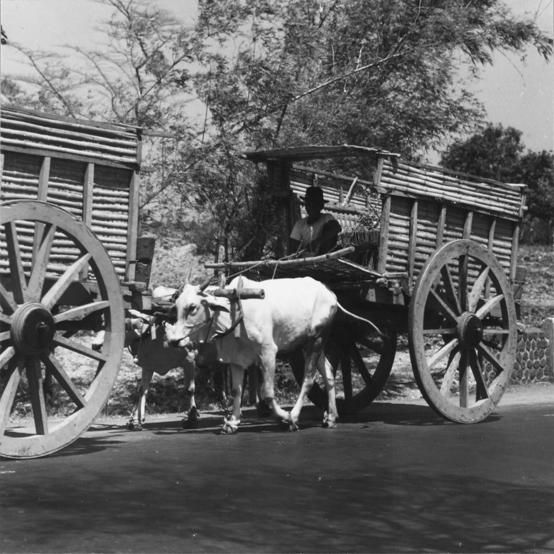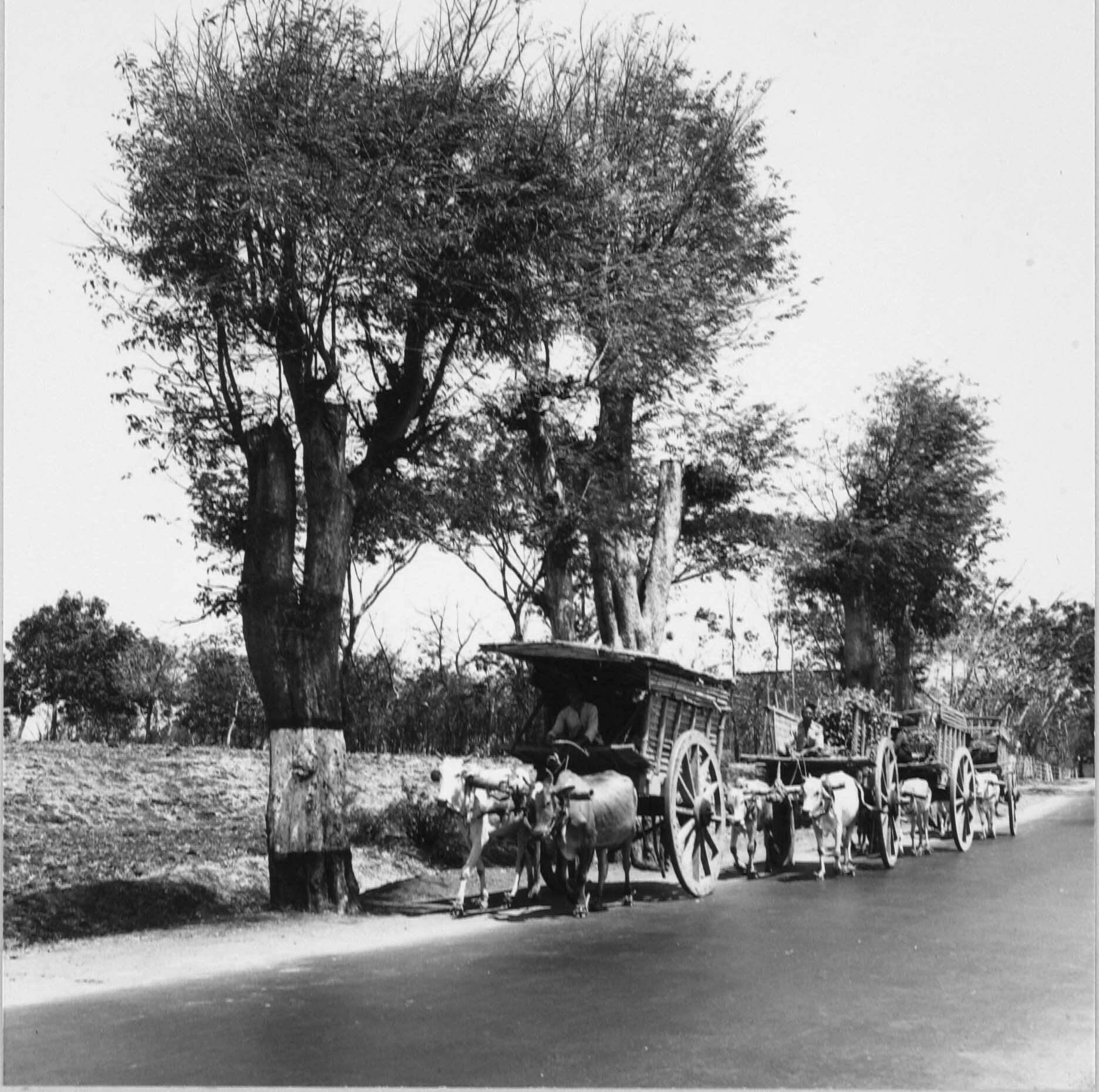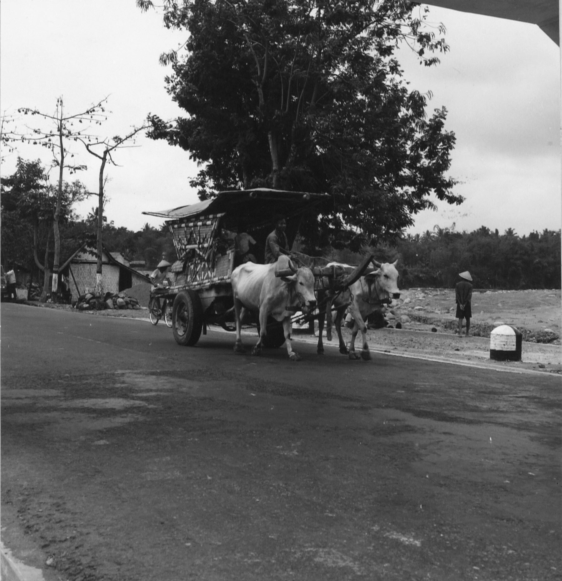 Ossekarren langs de grote weg in de buurt van Pasuru...