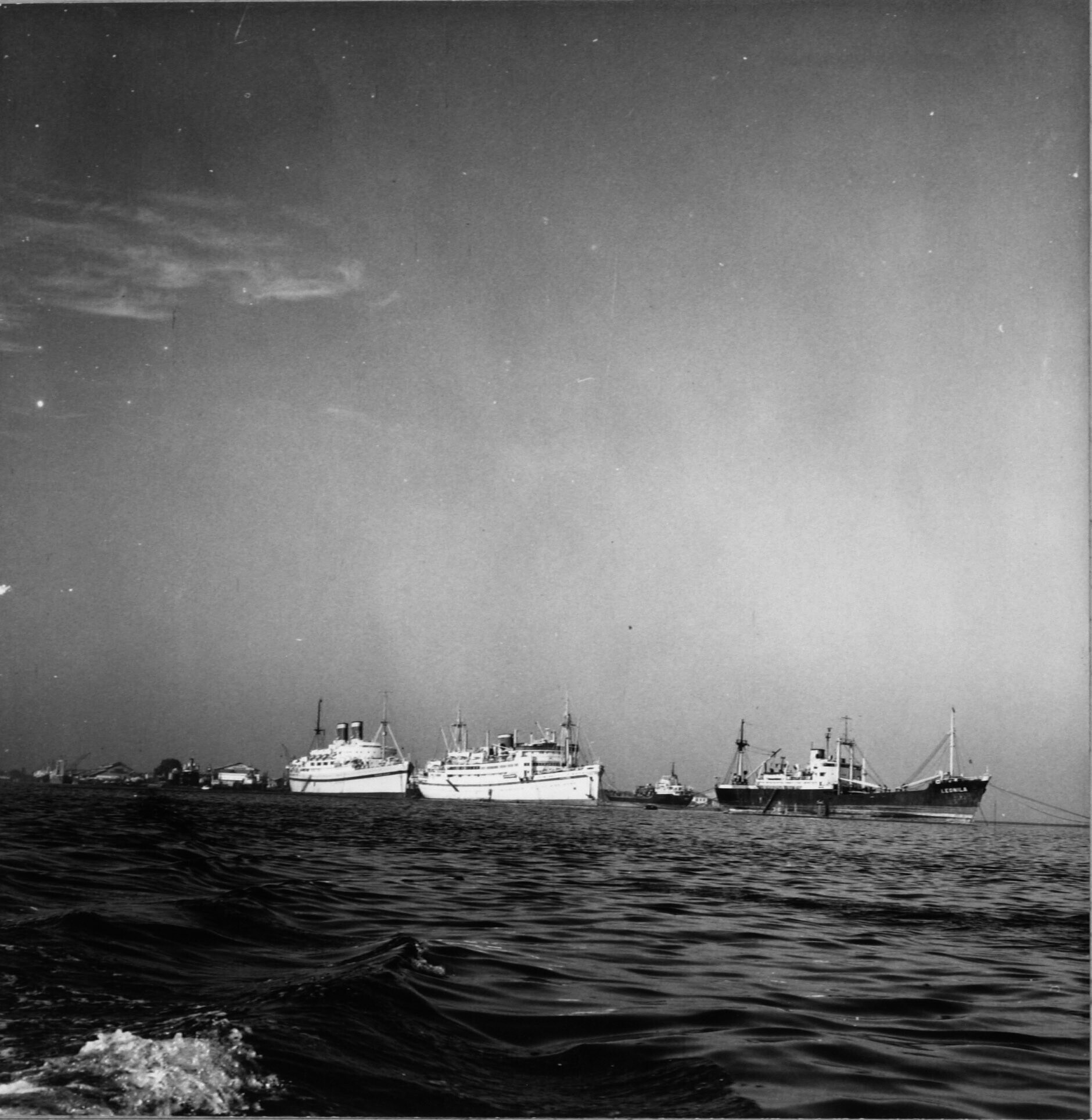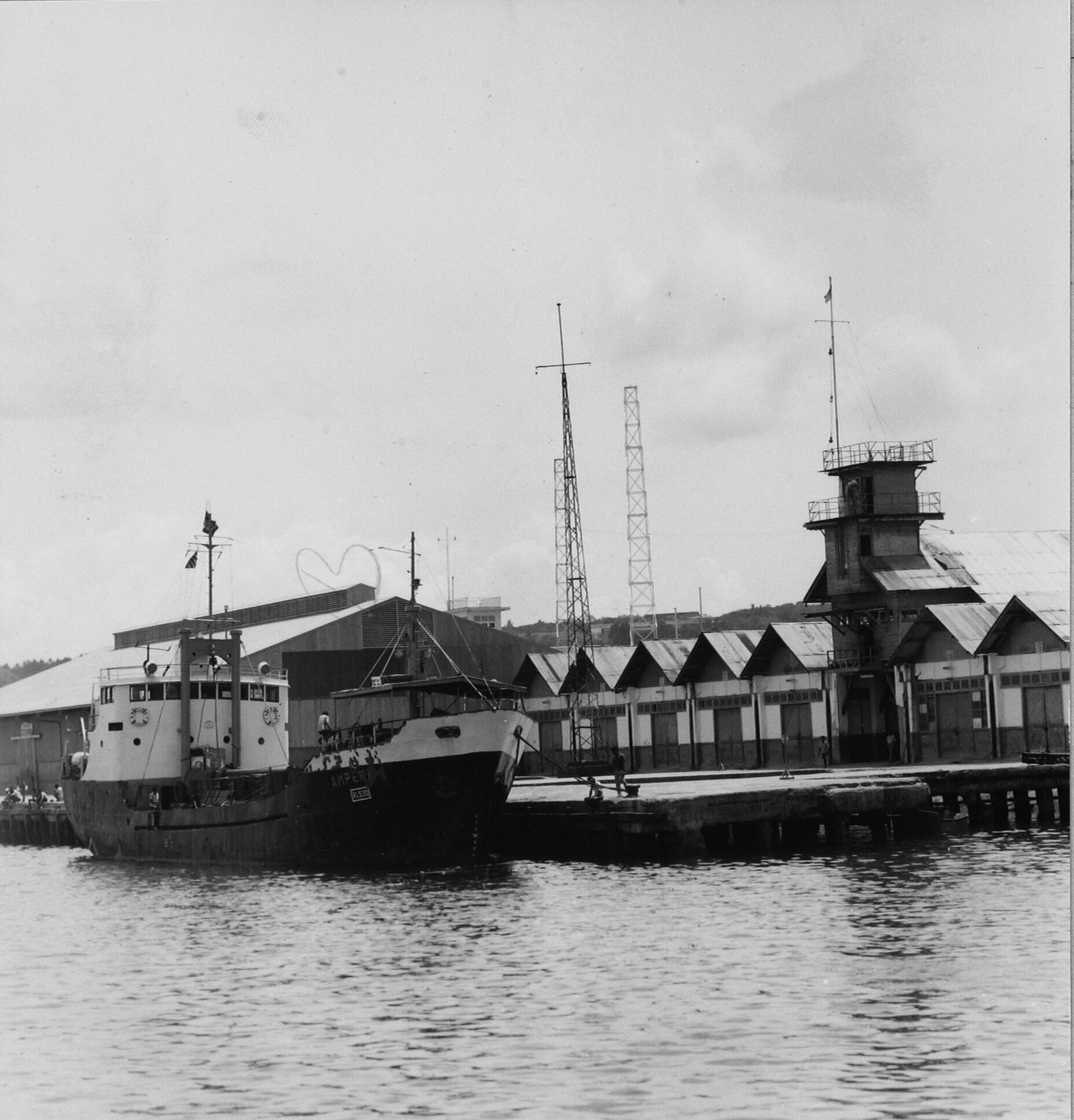 Kustvaarder ligt gemeerd aan de kade, rechts de have...