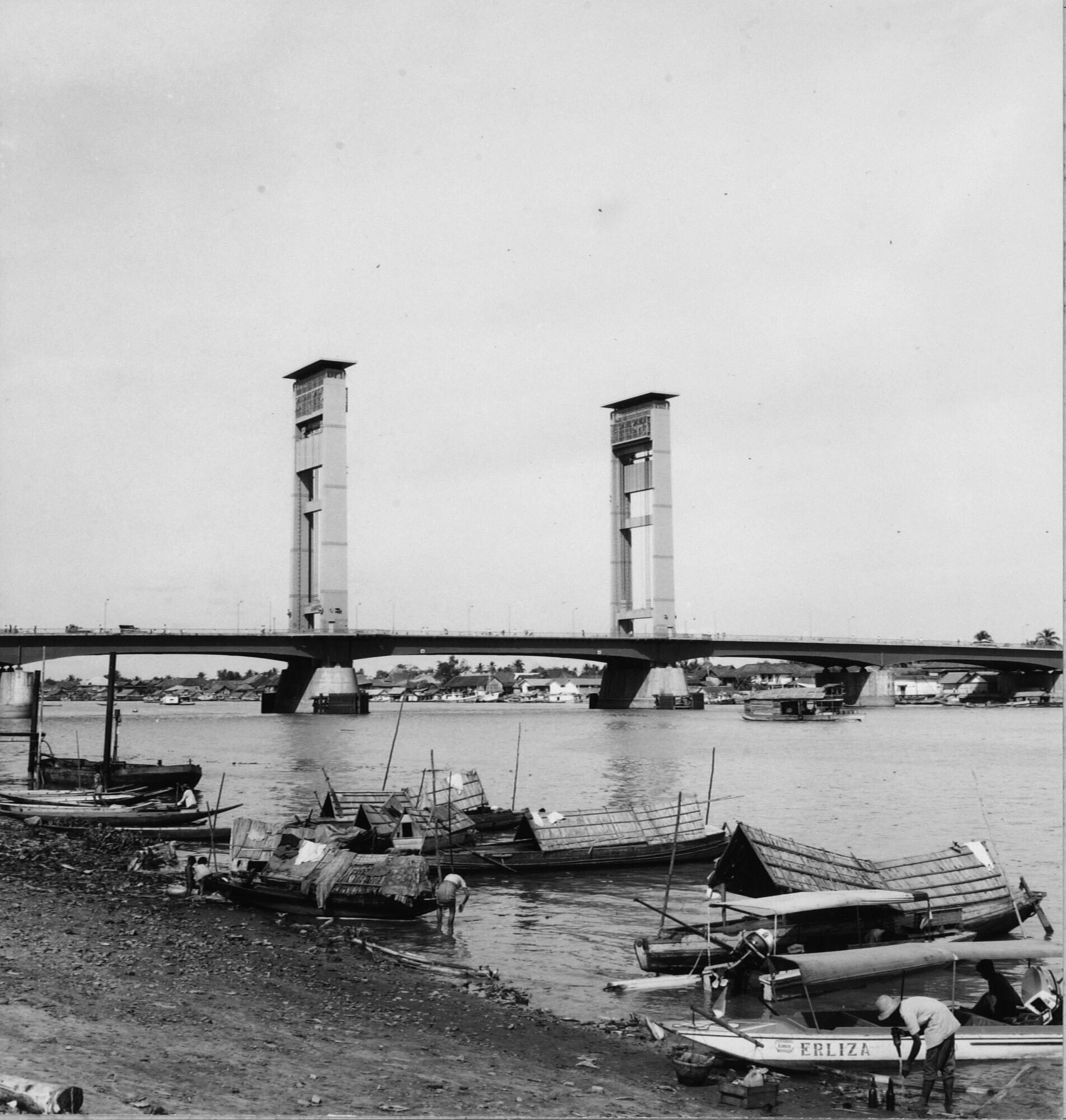 Gezicht op de Amperabrug over de rivier de Musi, aan...