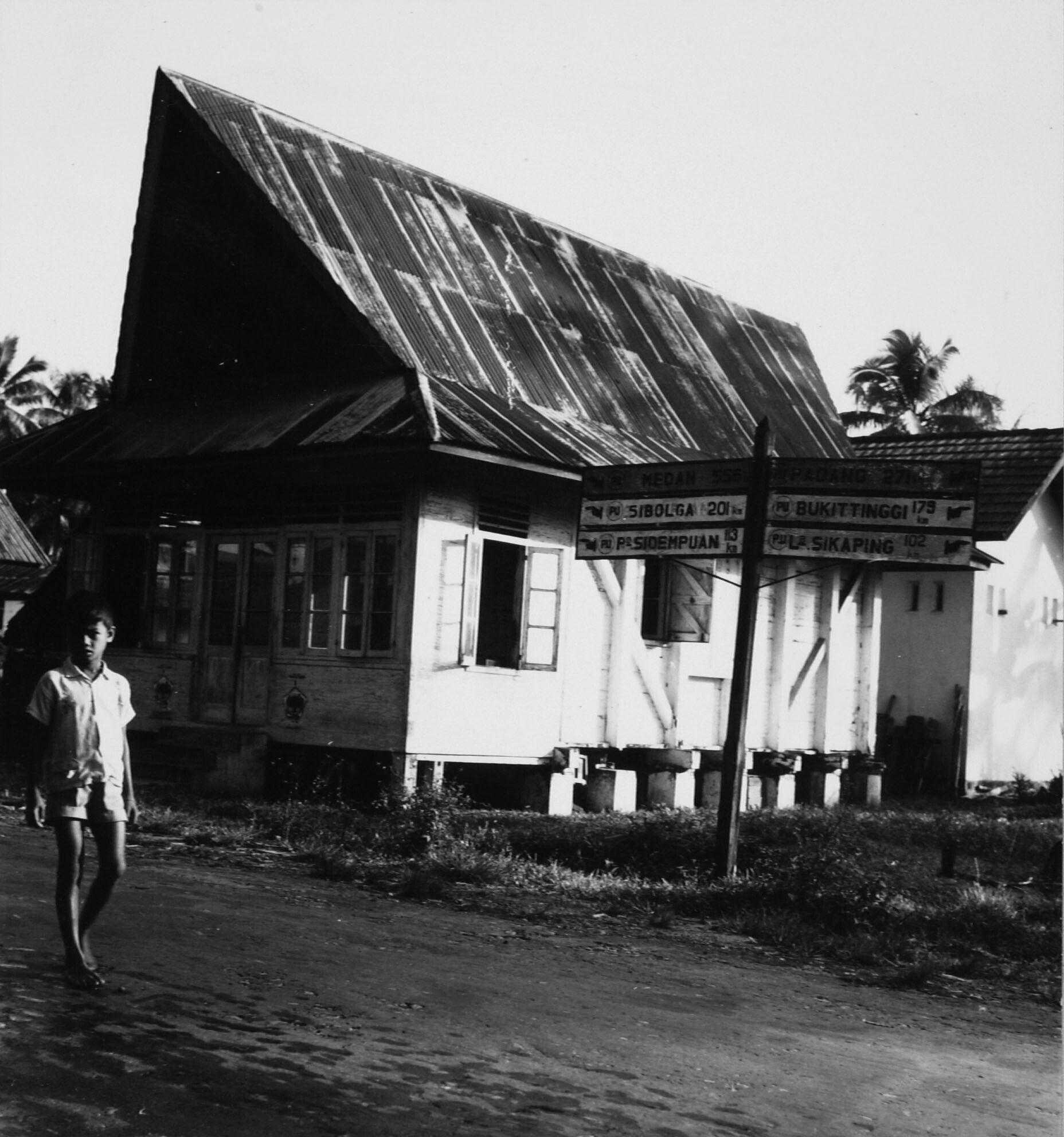 De wegwijzer in het centrum van Hutanopan, er is een...