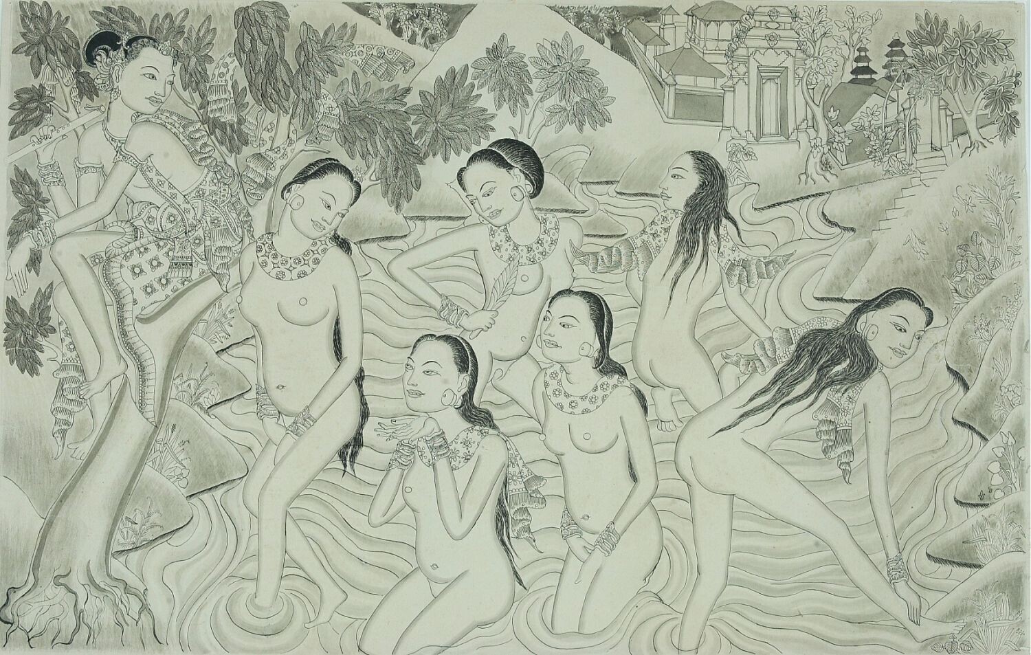 Krishna en zes vrouwen die zich baden in de rivier