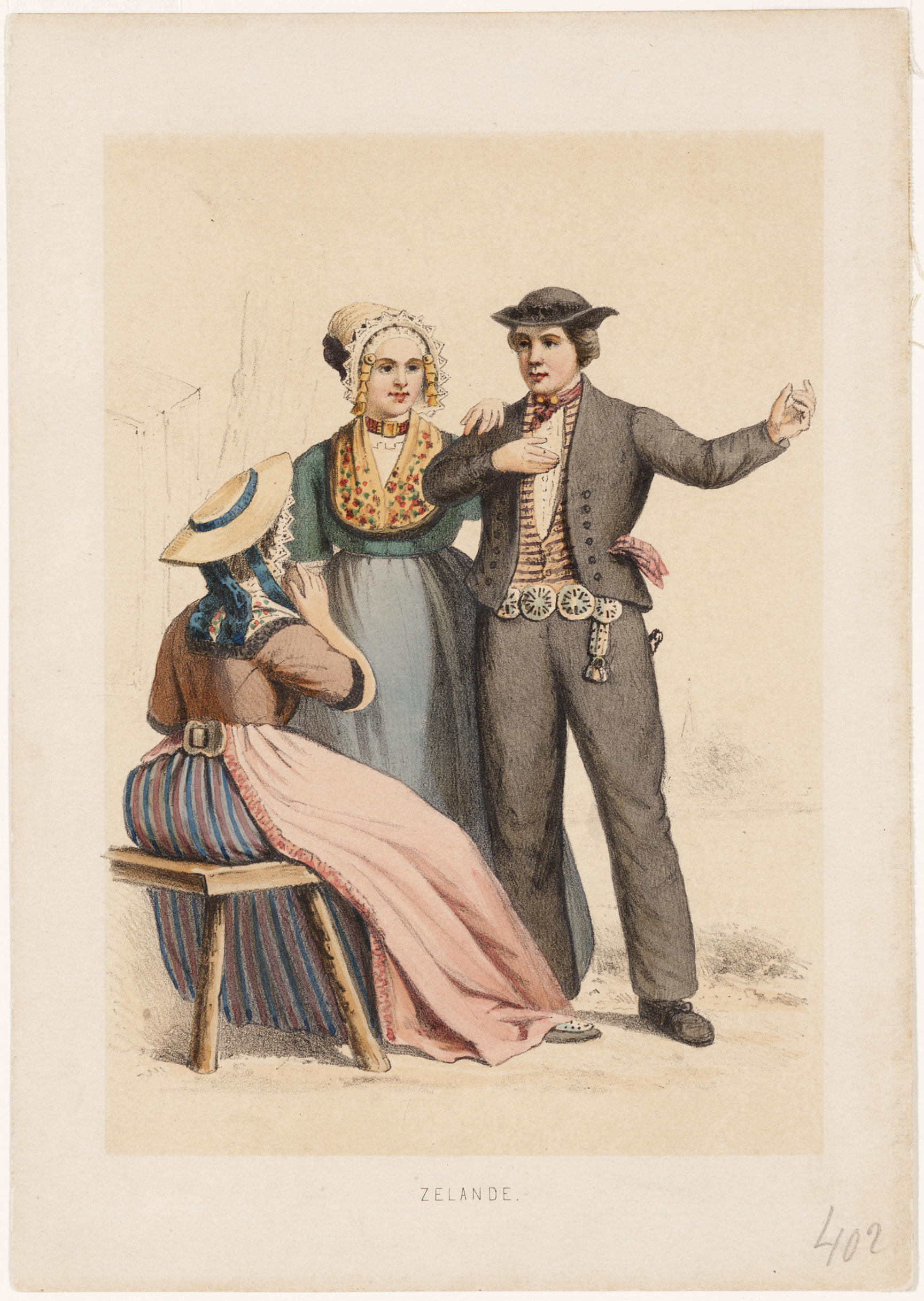 Twee vrouwen en een man in de dracht van Zuid-Beveland
