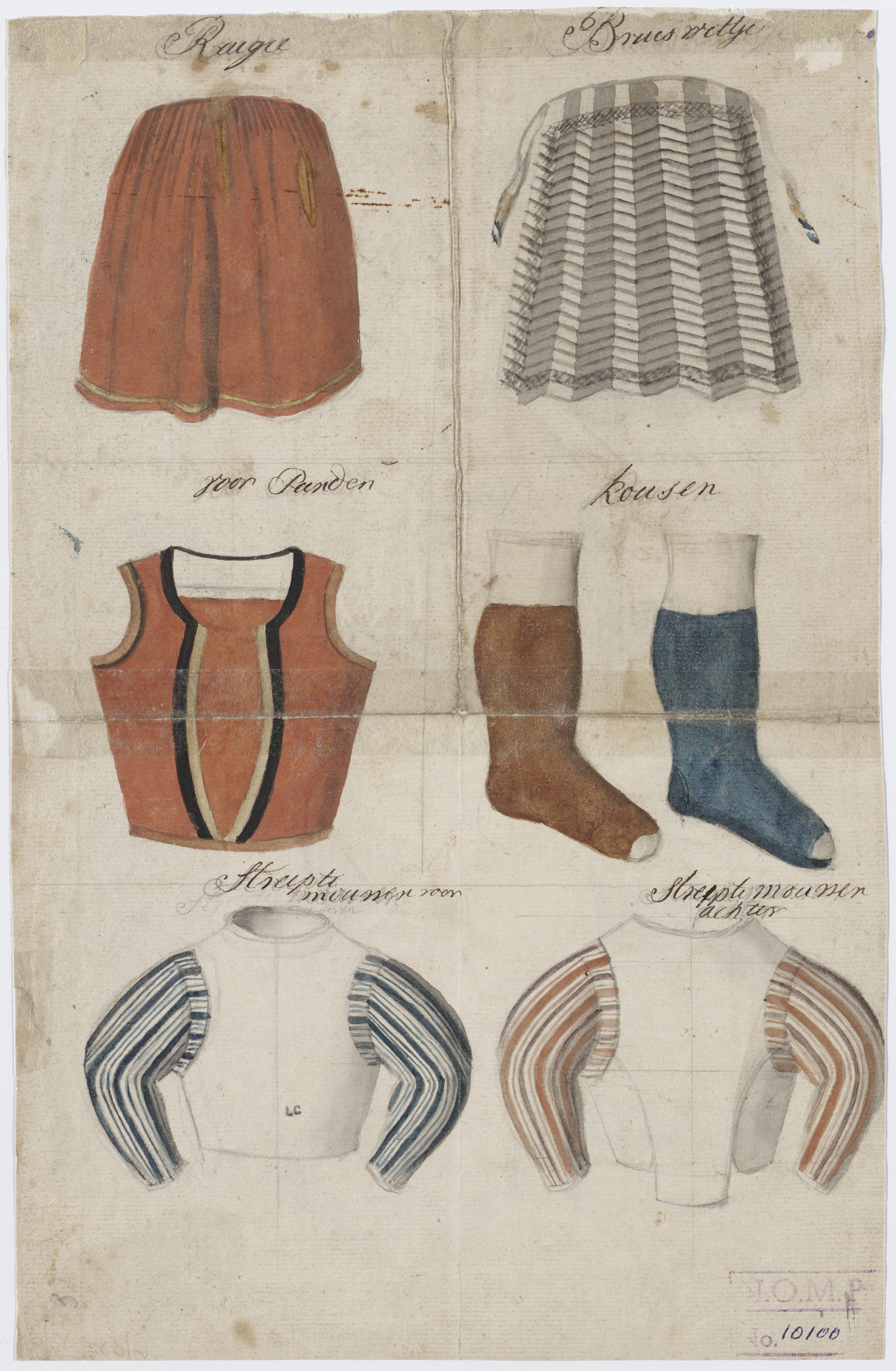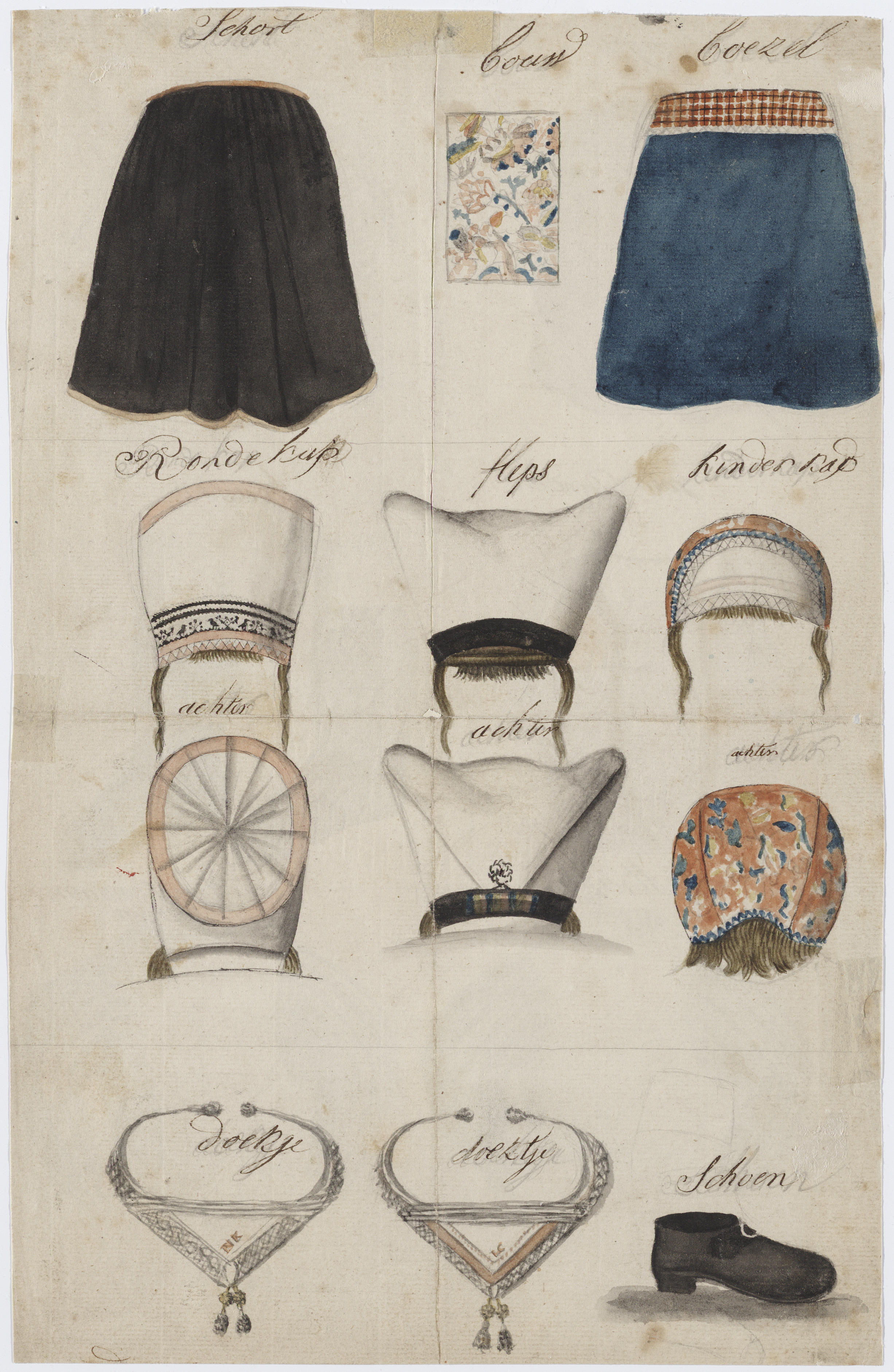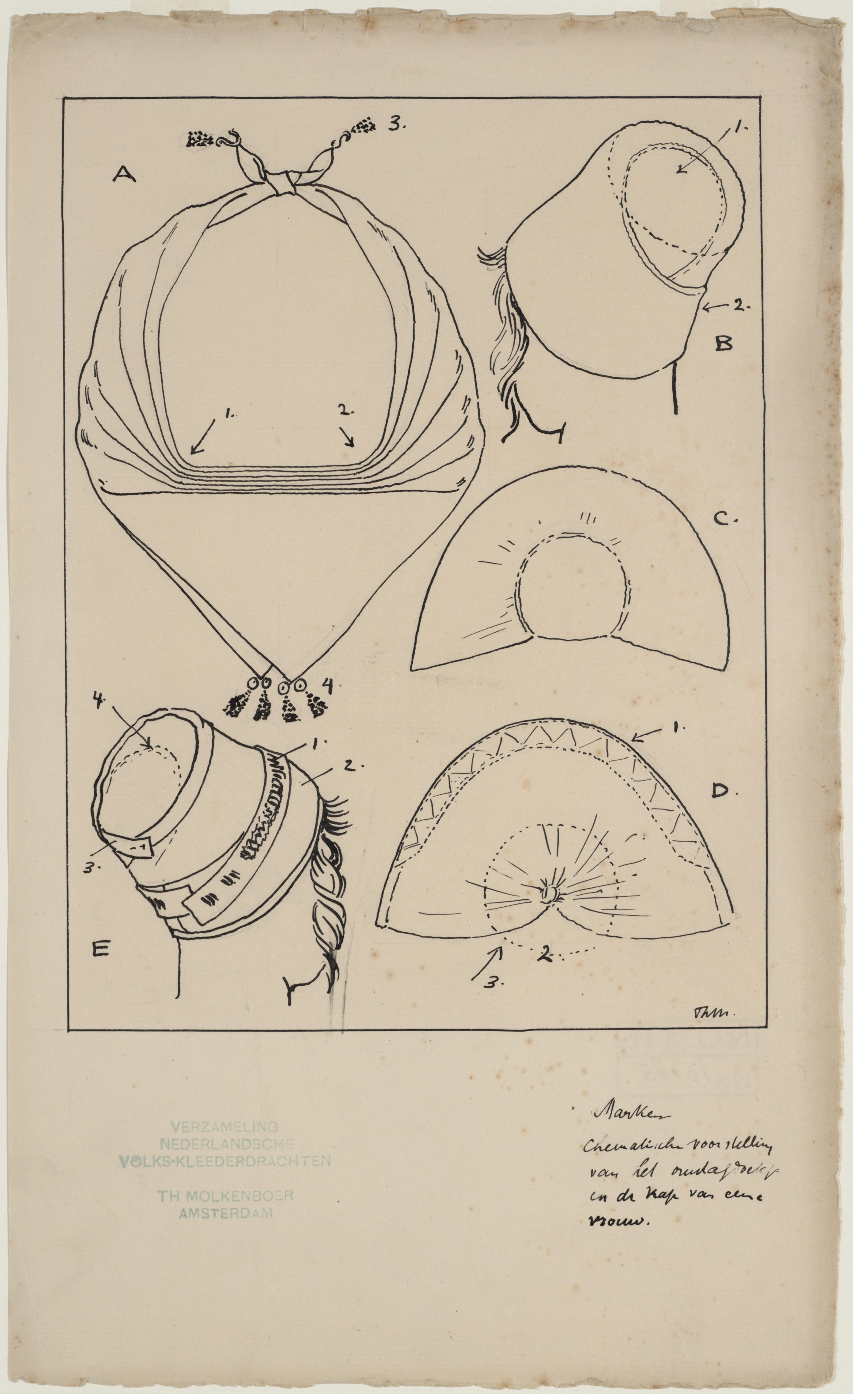 Tekening van halsdoekje en muts Marker vrouwendracht...