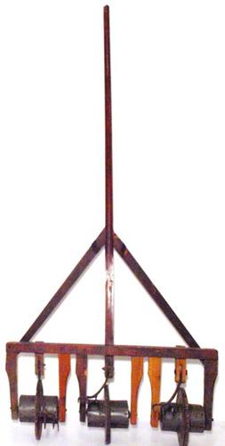 Zaaiwerktuig van hout met drie metalen trommels gebr...