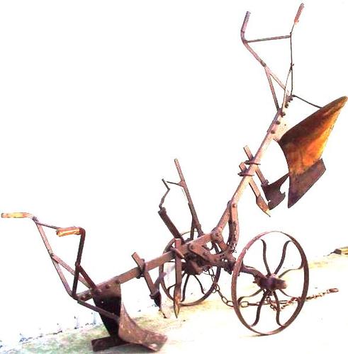 Kipploeg van metaal gebruikt om akkerland om te ploegen