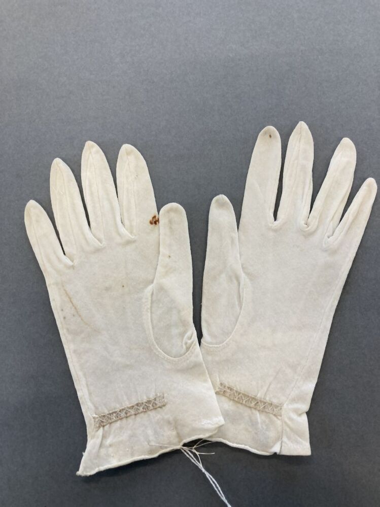 Paar crèmekleurige dameshandschoenen van tricot met ...