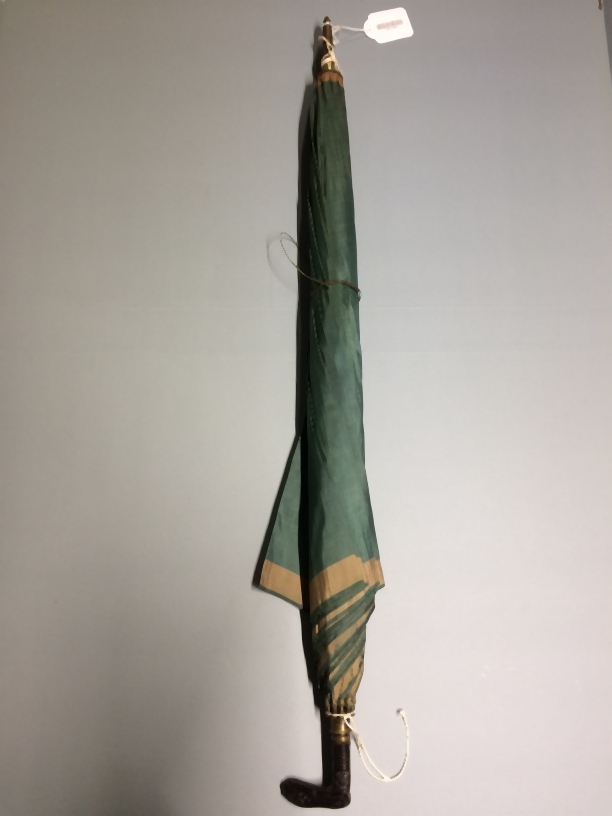 Paraplu van groene zijde, eindigend in een gele baan...