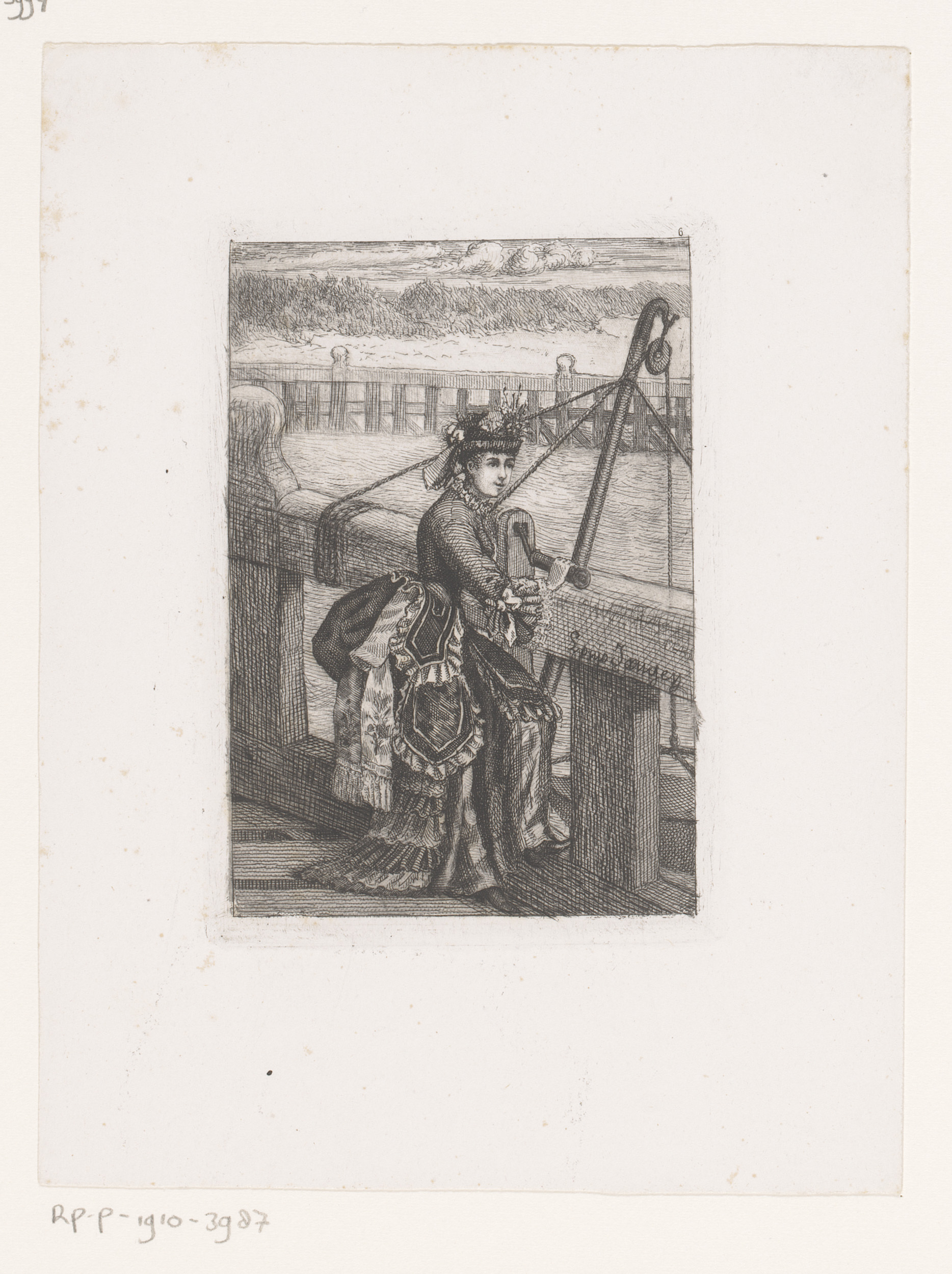 Vrouw op de kade bij een takelkraan met roeiboot