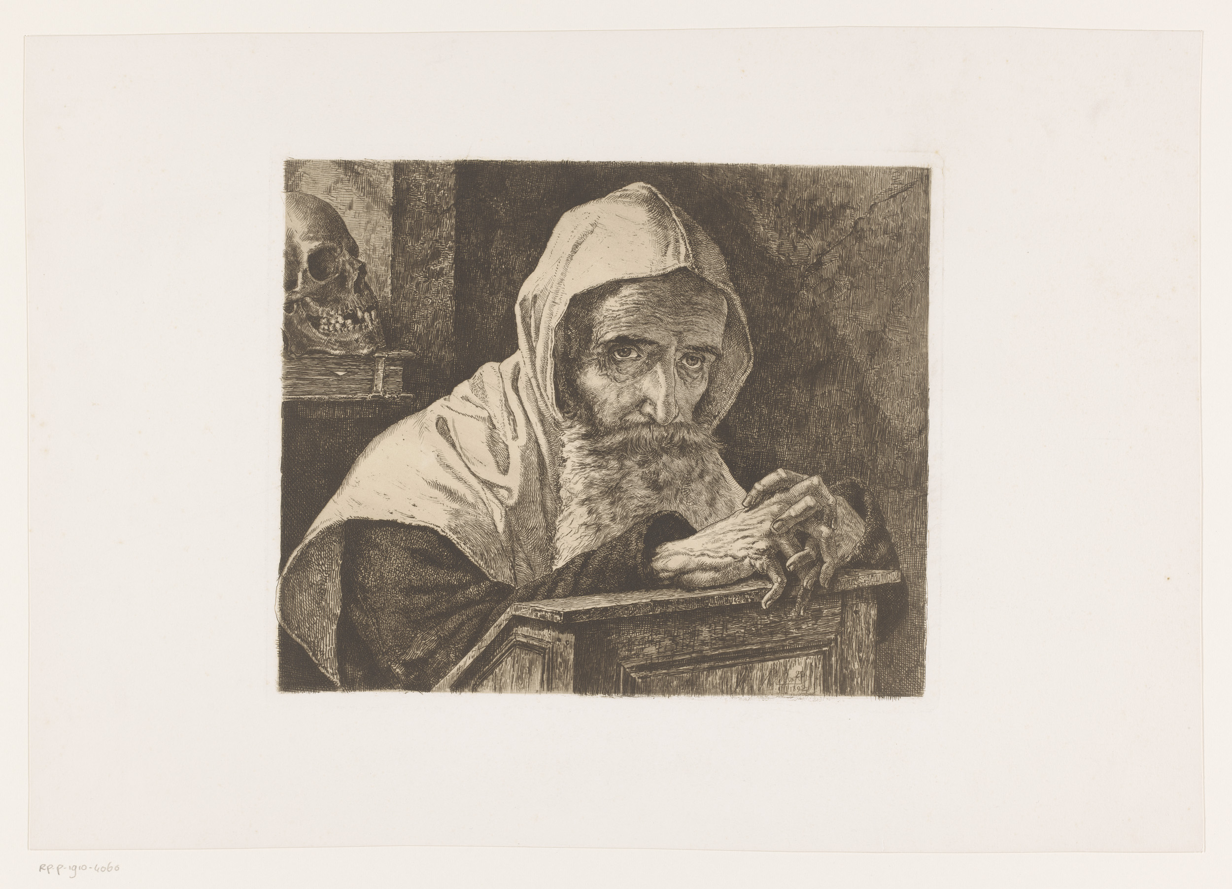 Oude man met baard en kap zit met gevouwen handen op...