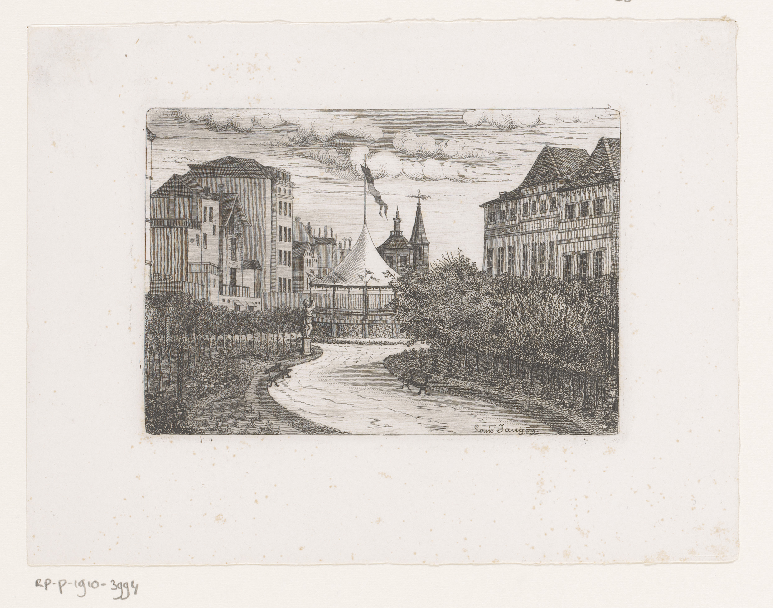 Gezicht op een park met paviljoen