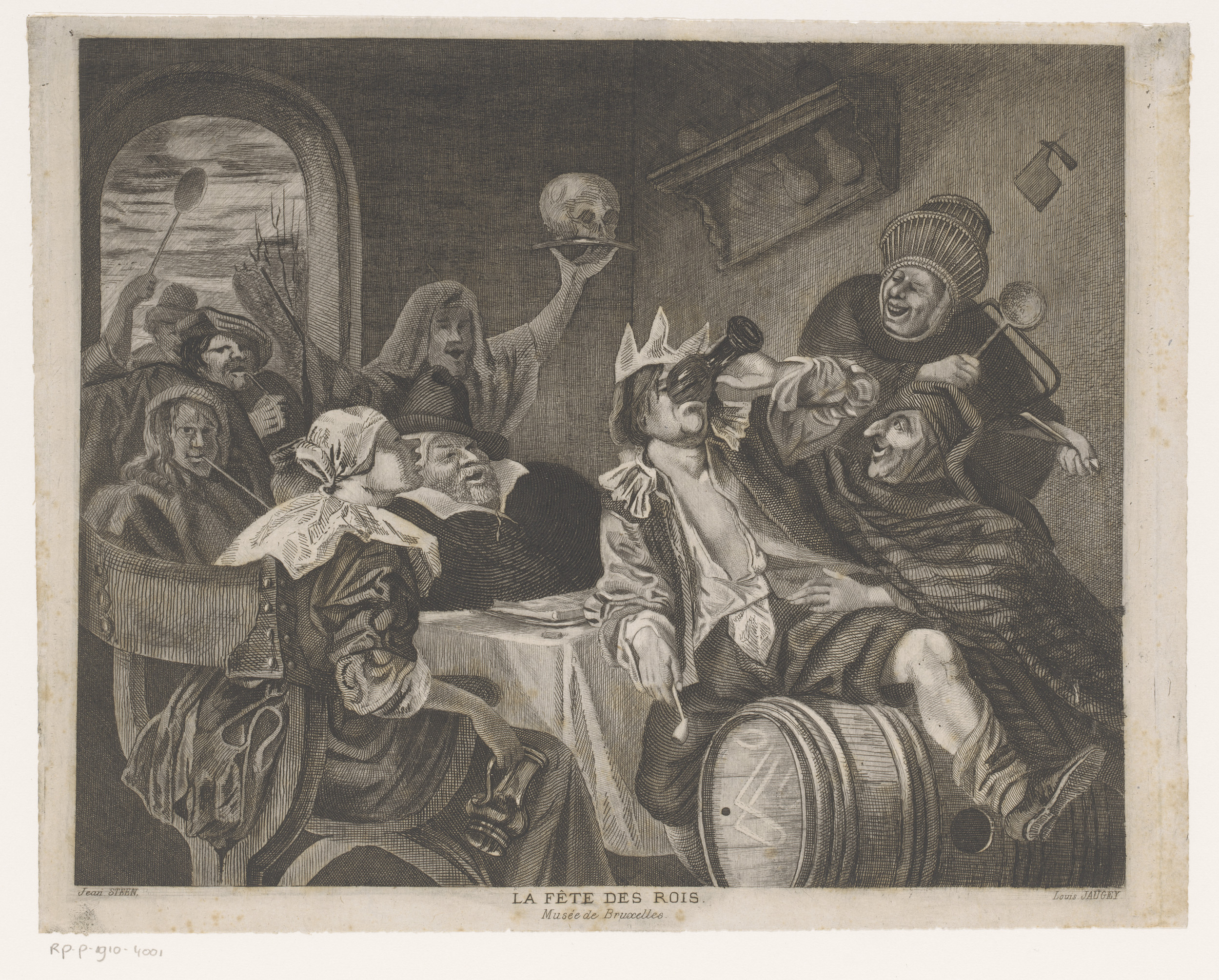 Feestend gezelschap met een drinkende man met kroon