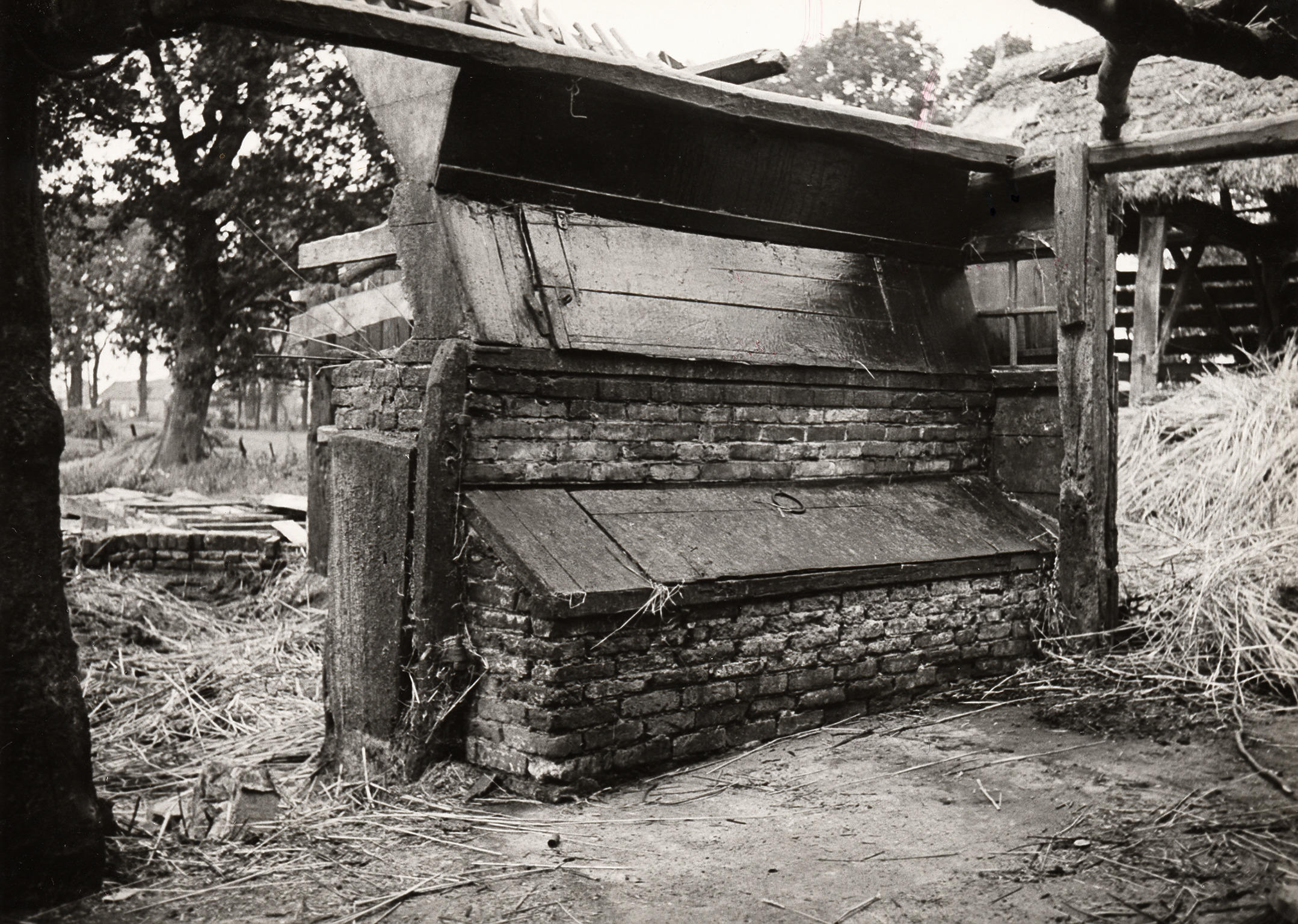 Afbraak van boerderij, Staphorst, 1950 (zwart-wit foto)