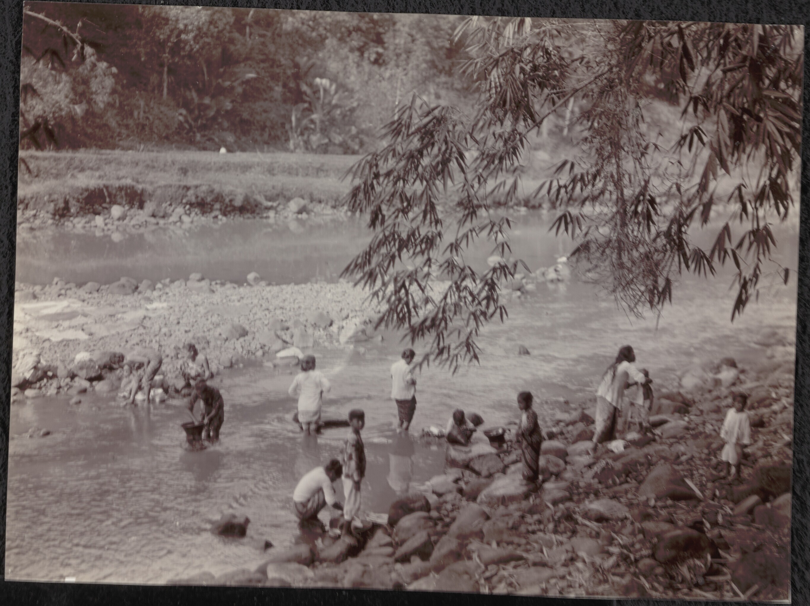 Dorpsbewoners vissen met kruisnetten in de ondergelo...