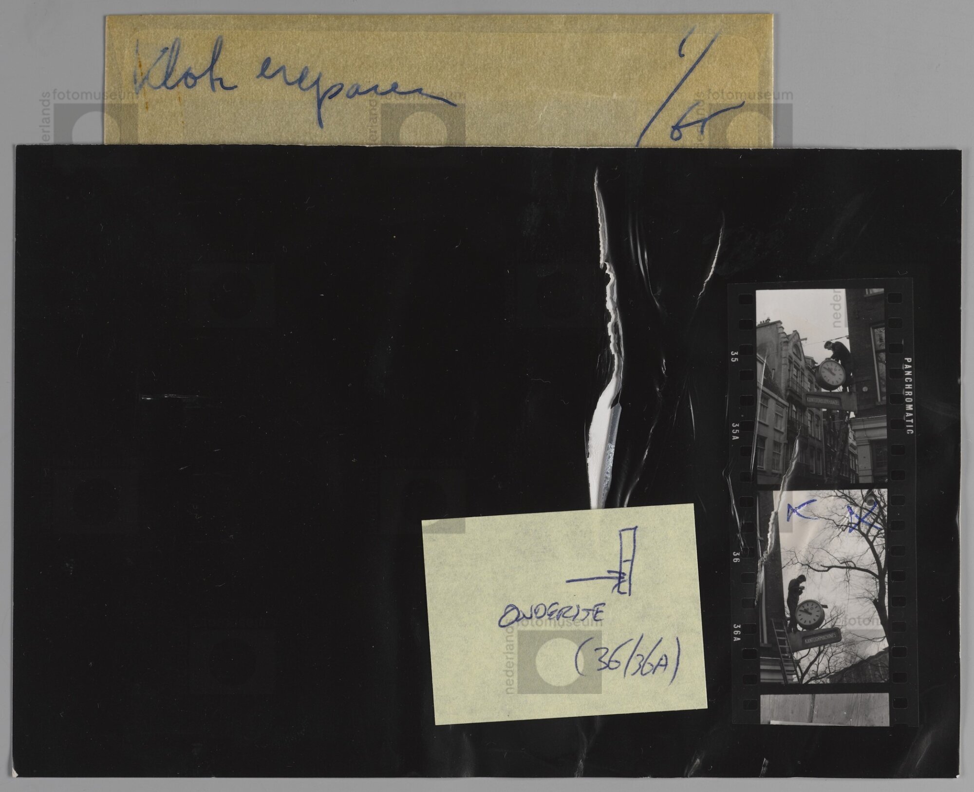 Amsterdam. Man repareert een buitenklok aan de gevel...