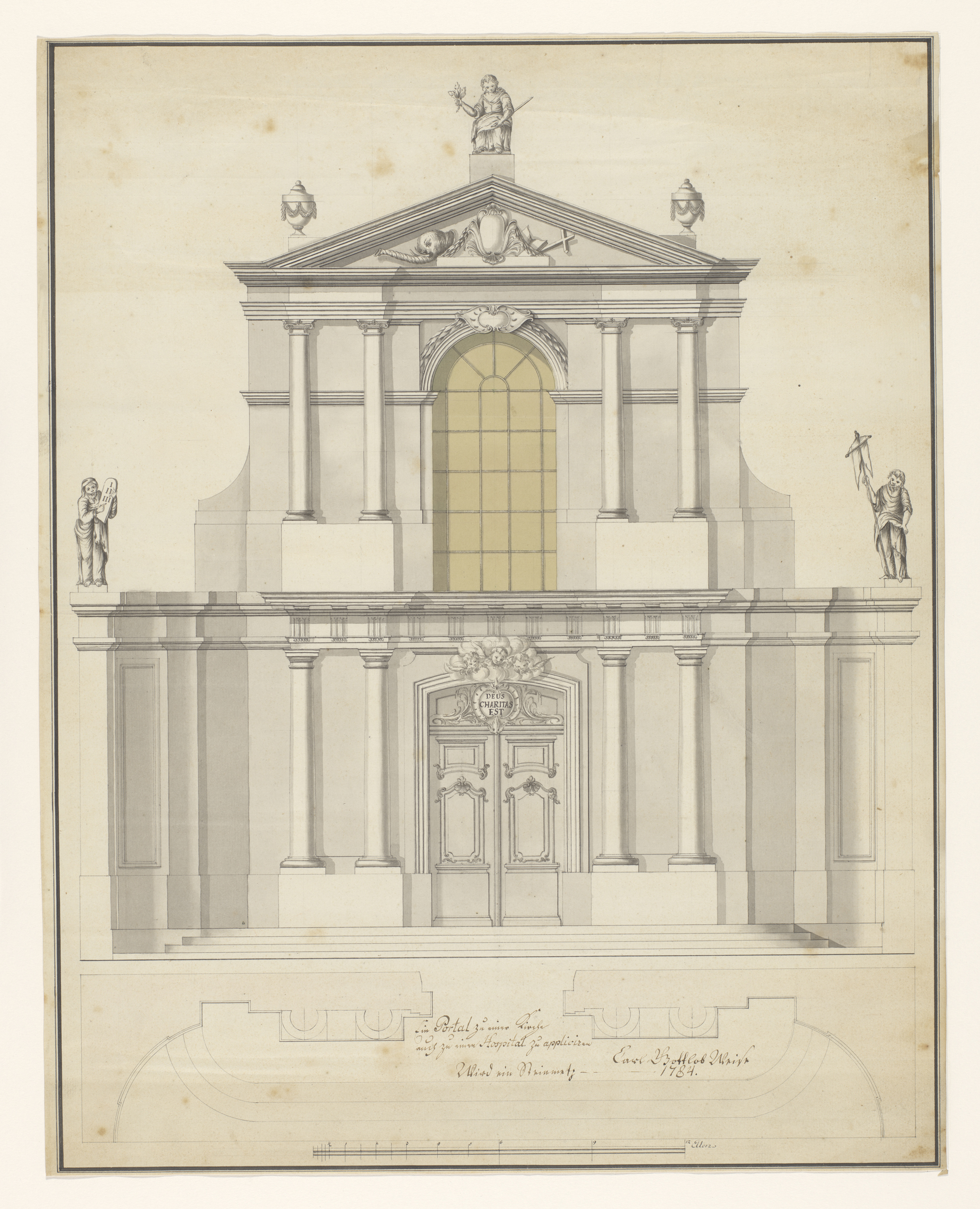 Ontwerp voor de ingangspartij van een kerk, met eron...