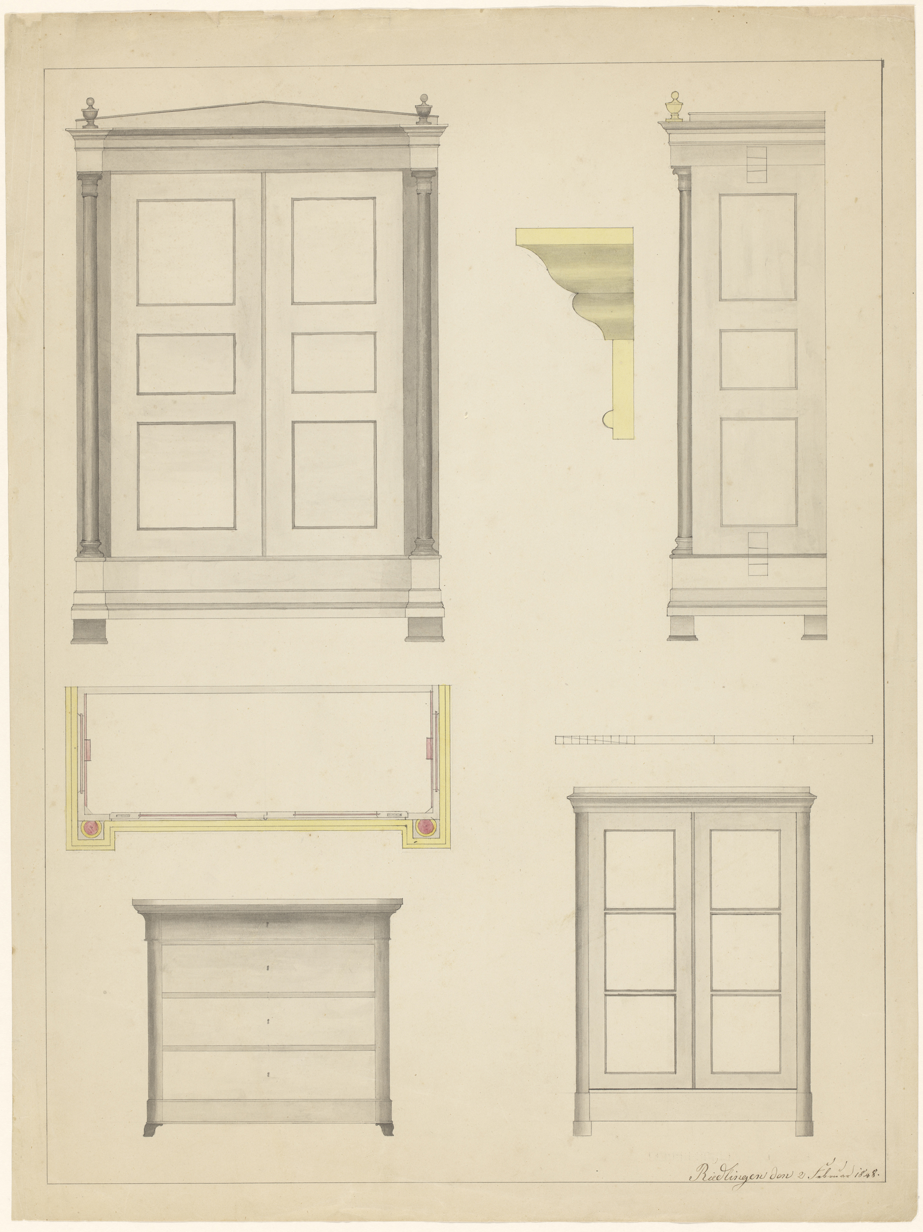 Ontwerp voor een commode met zijaanzicht, een tweede...