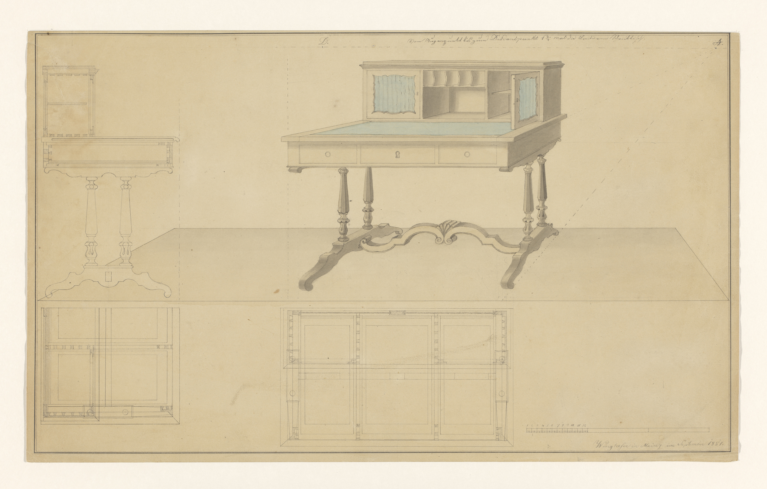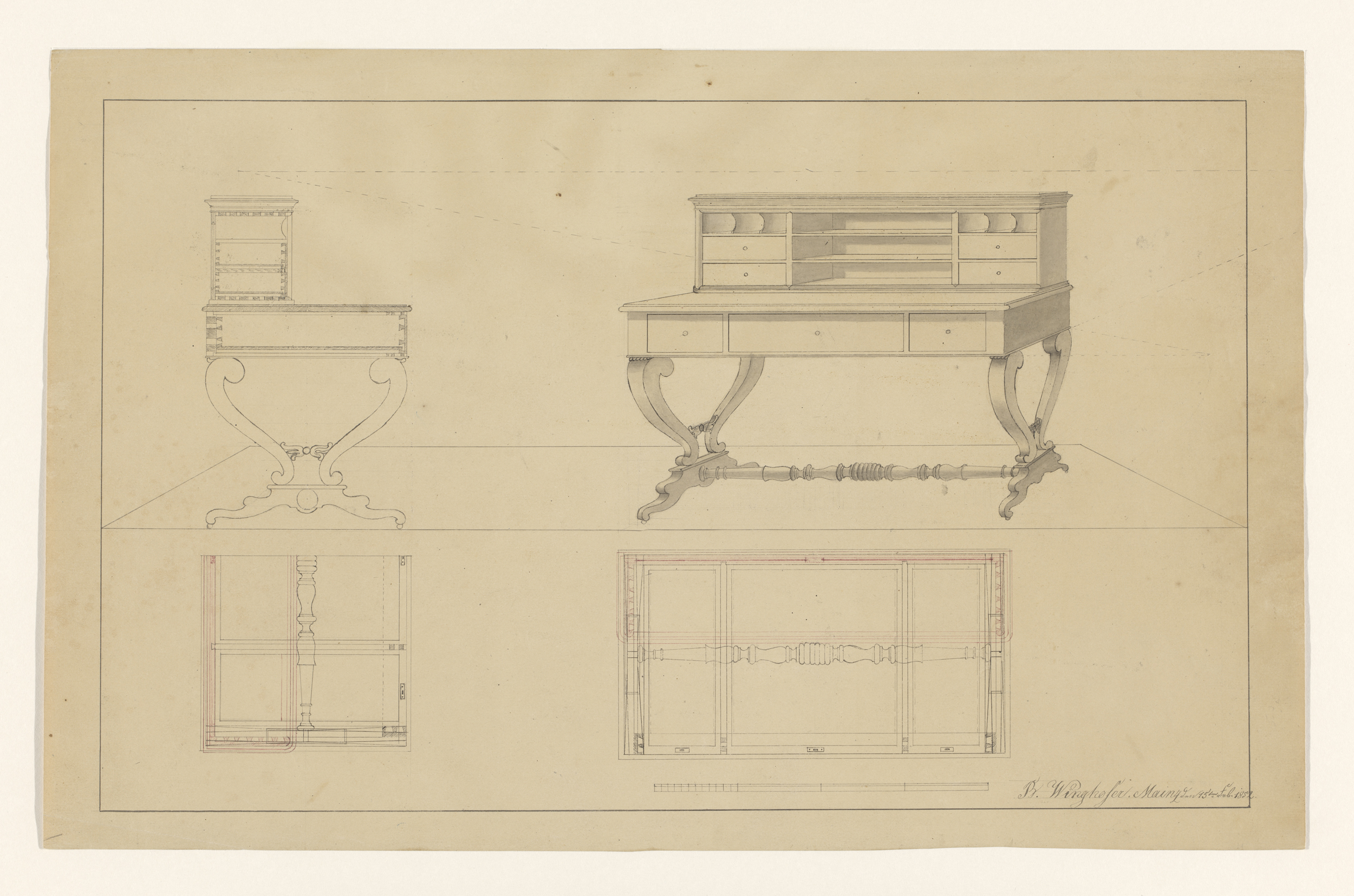 Ontwerp voor een schrijftafel met opstand, met zijaa...