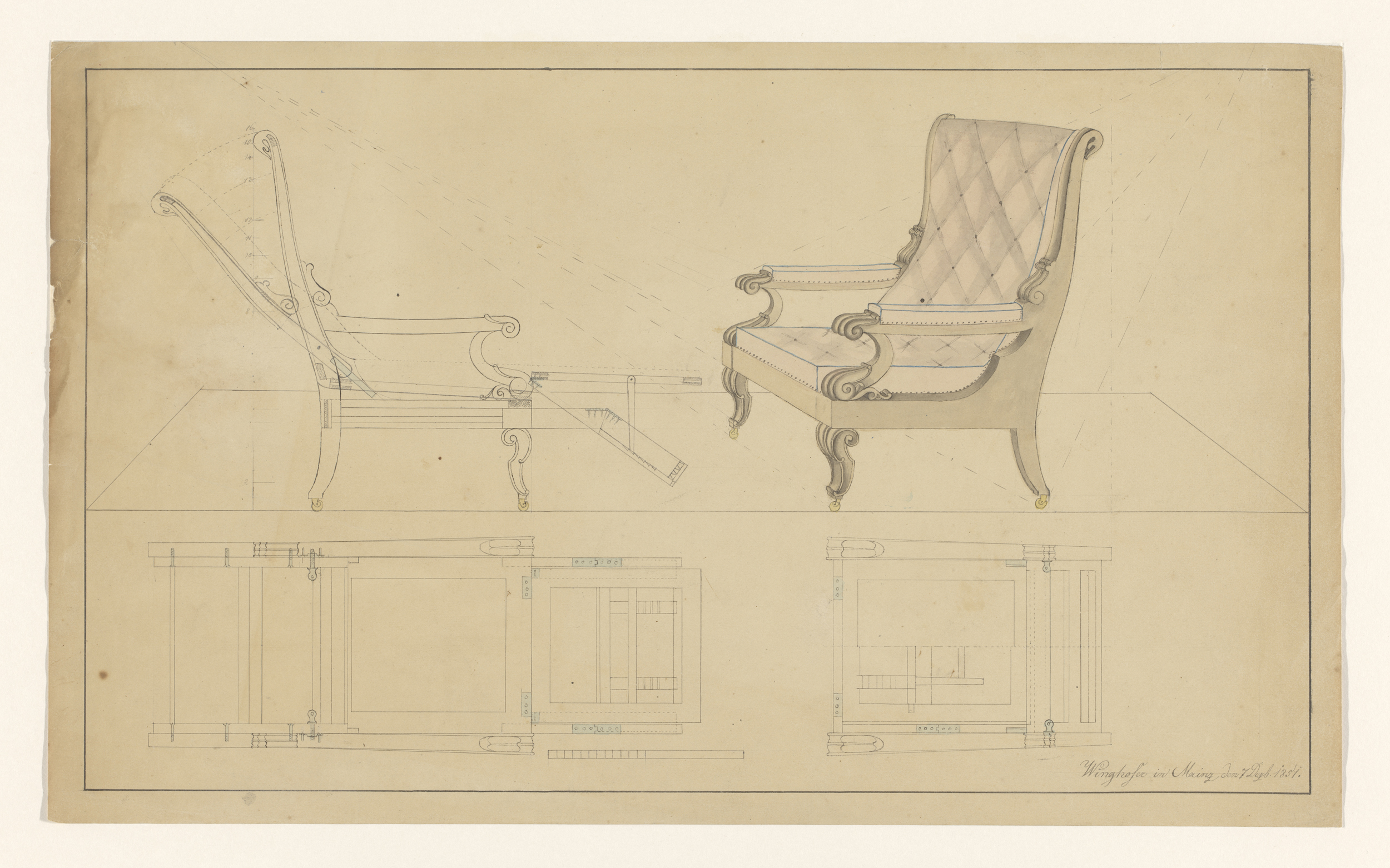 Ontwerp voor een beklede armstoel met wangen en kope...