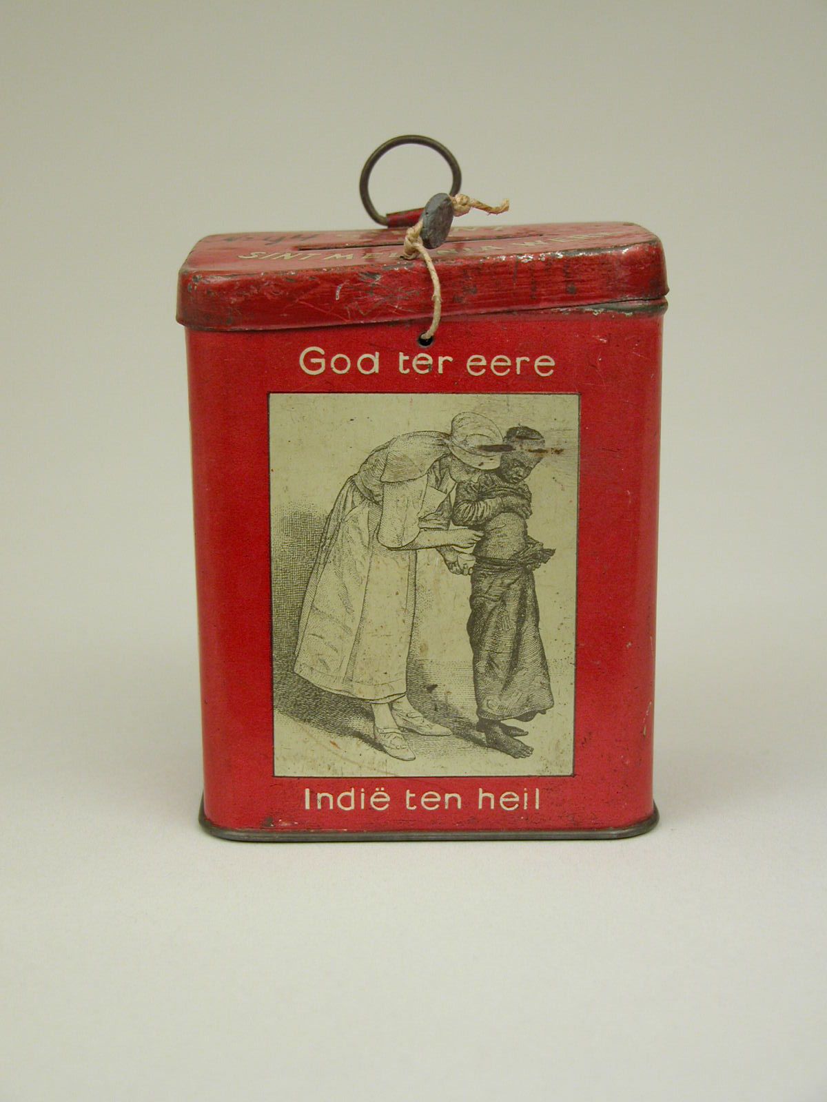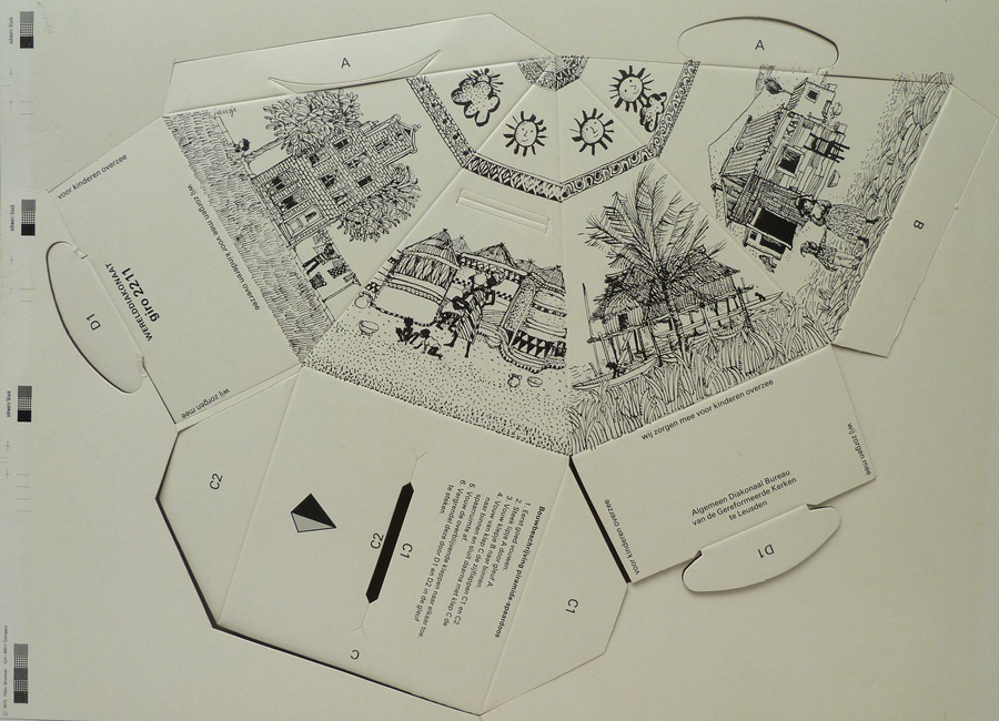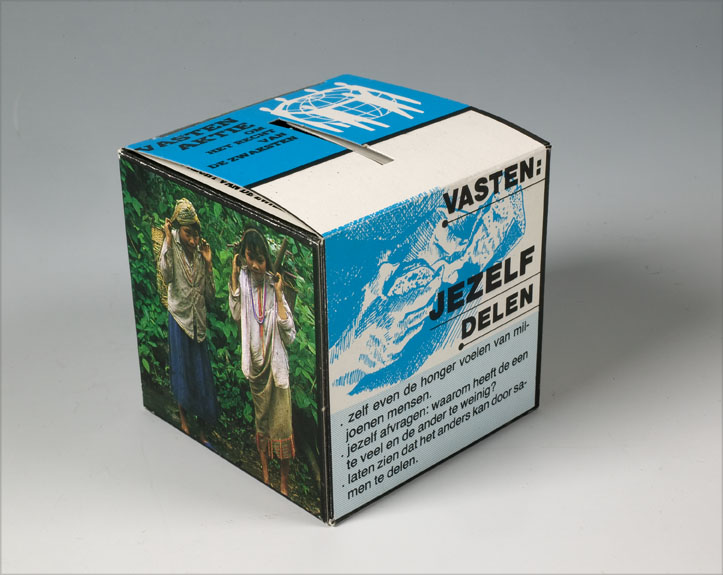 Kubusvormige spaarpot met "vastenaktie, om het recht...