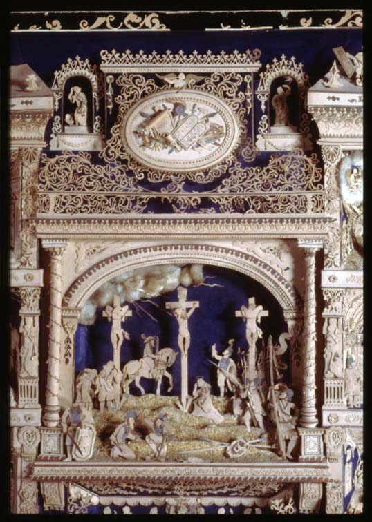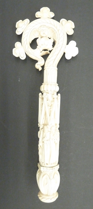 Ivoren bekroning van een kromstaf met zes heiligen e...