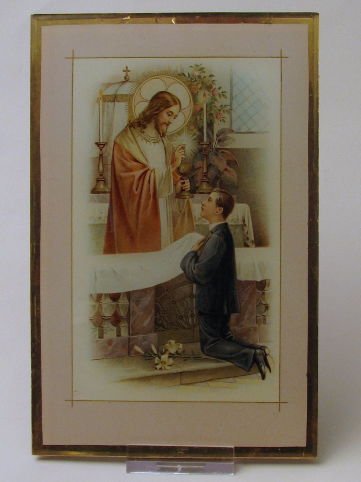 Prent met Christus en jongen voor een altaar met kel...
