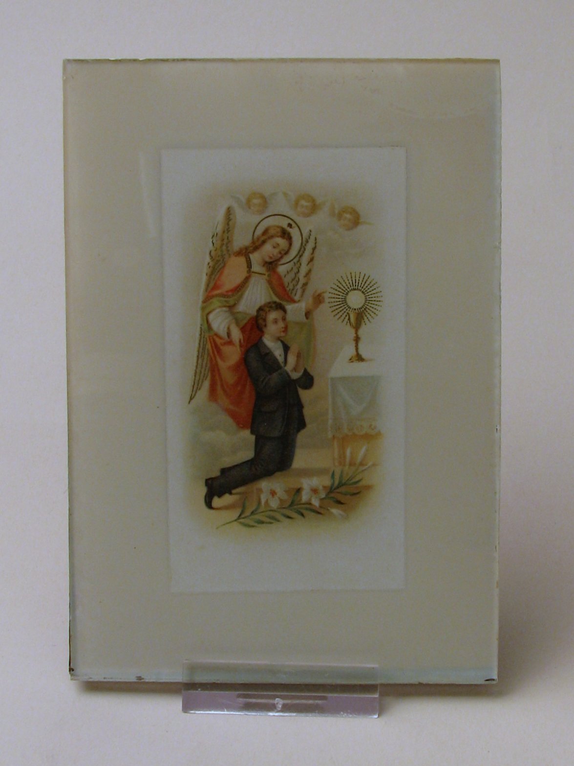 Prent met engel en jongen voor een altaar met kelk, ...