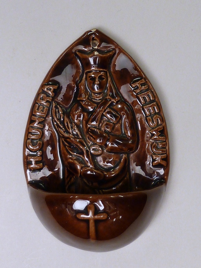 Donkerbruin geglazuurd wijwaterbakje met H. Cunera m...