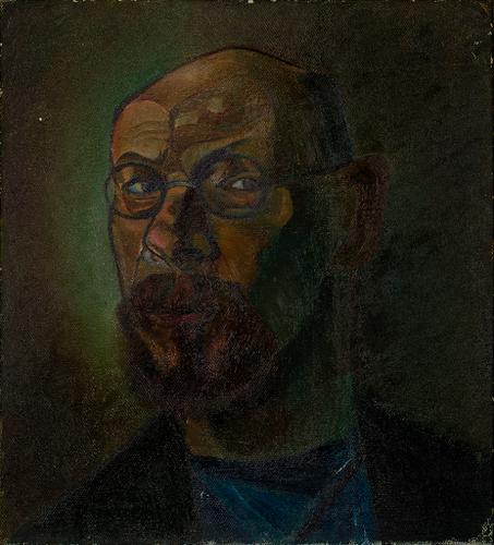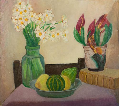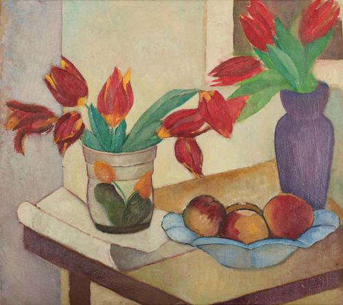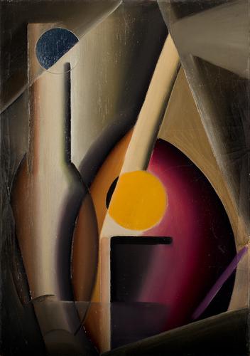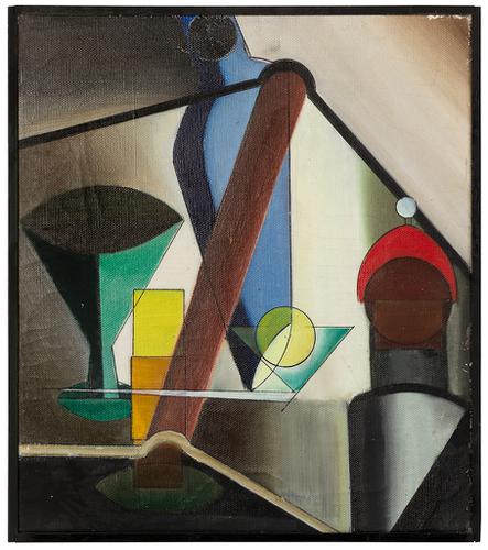 Een compositie van voorwerpen, met gestileerde lamp ...