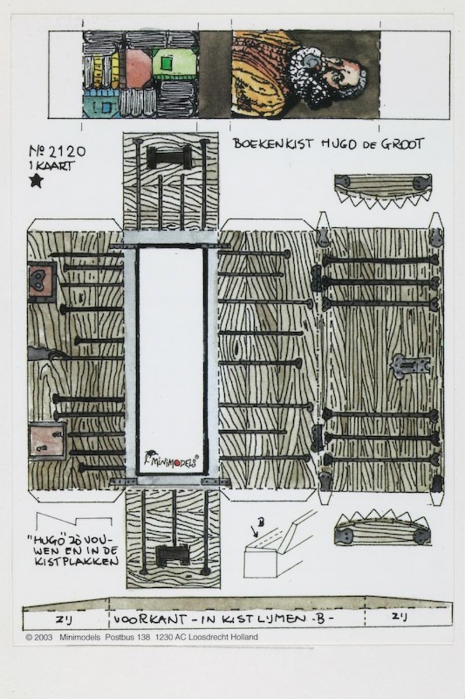 Hugo de Groot verbergt zich in de boekenkist,