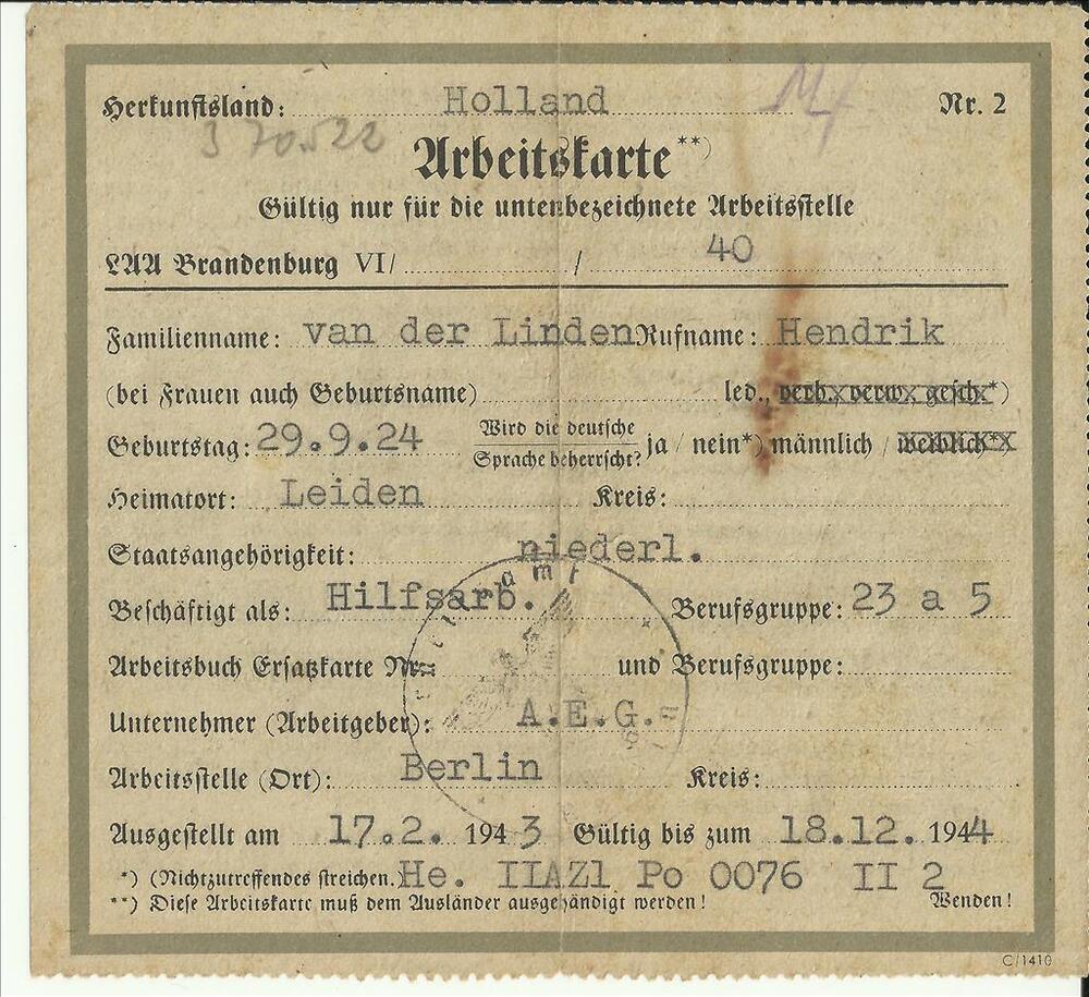 Arbeitskarte H. van der Linden geboortedatum 29 sept...
