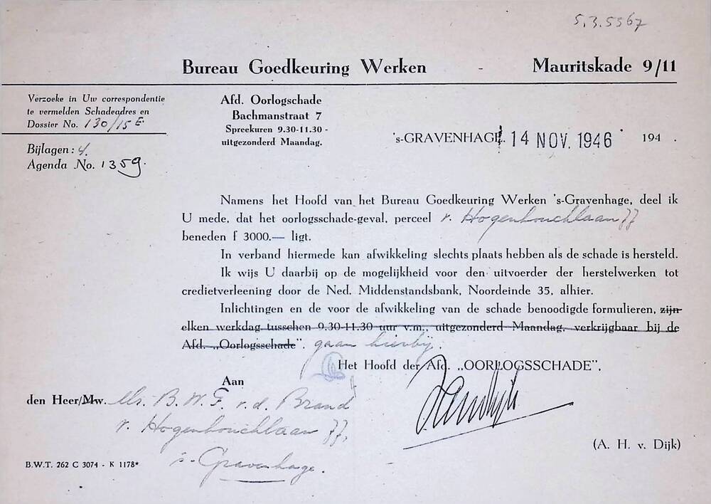 Brief van Bureau Goedkeuring Werken aan B.W.F. v.d. ...