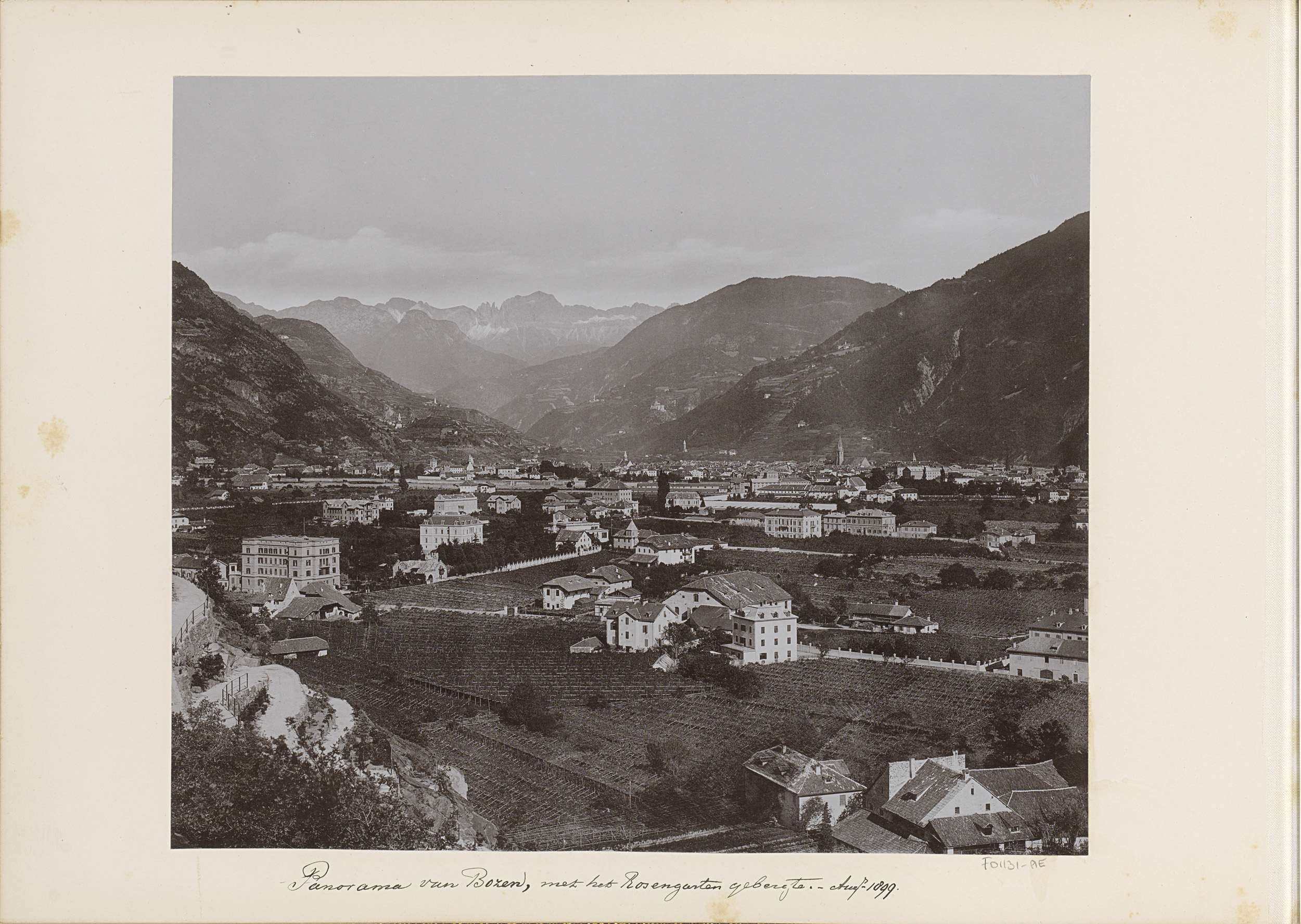 Gezicht op Bolzano en het Rosengartenmassief