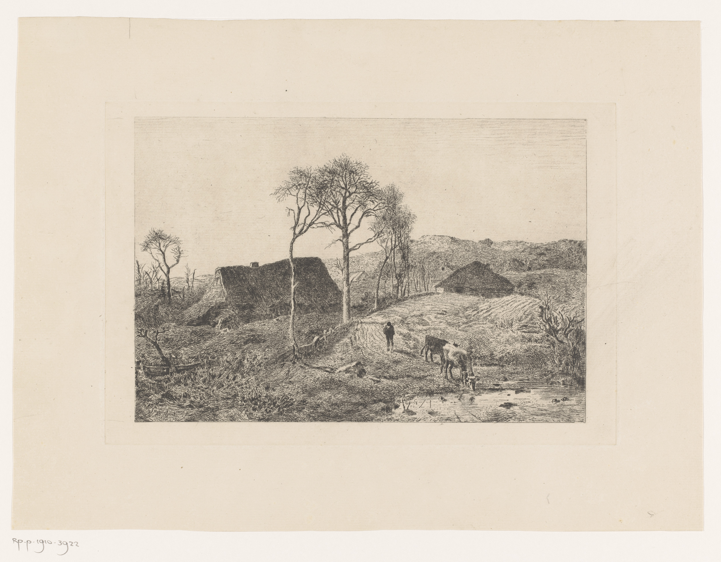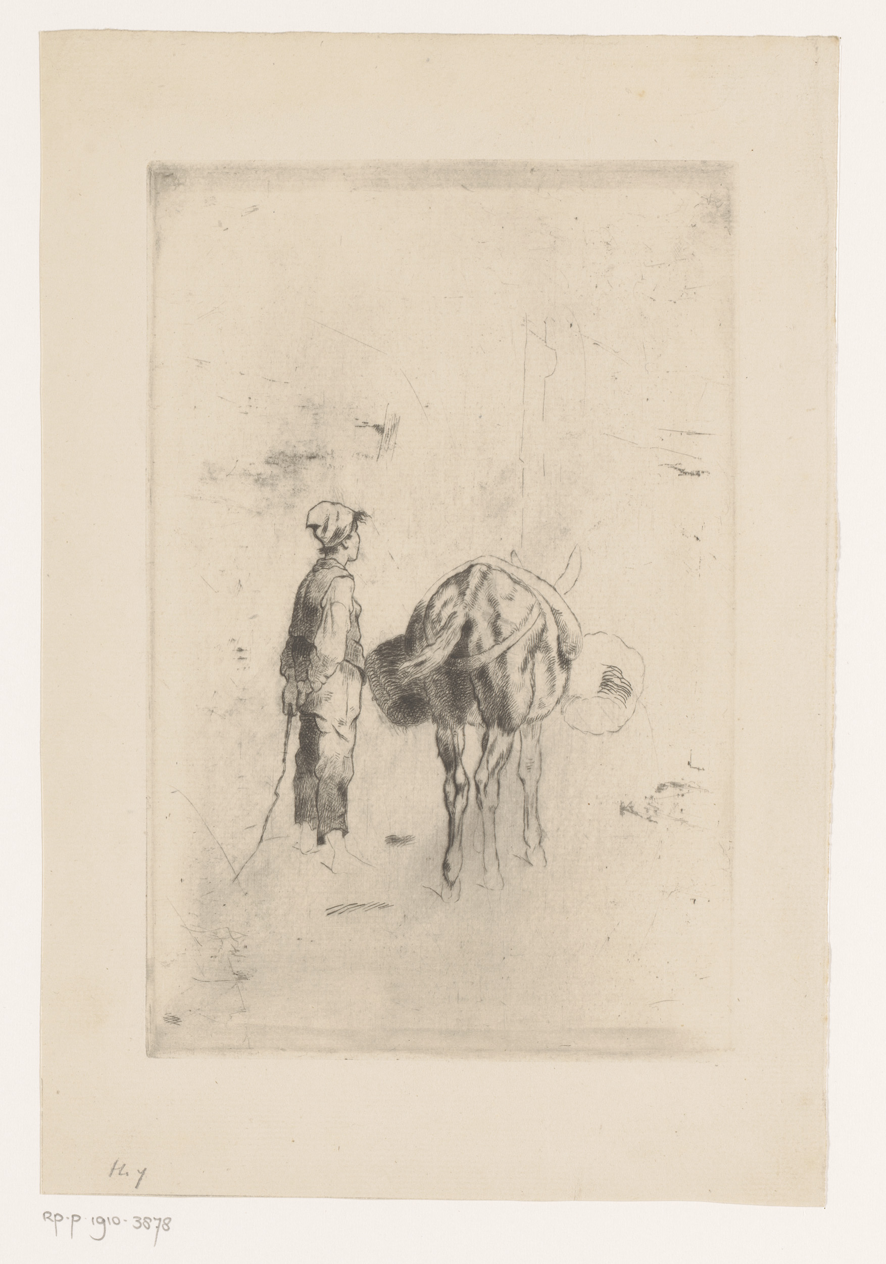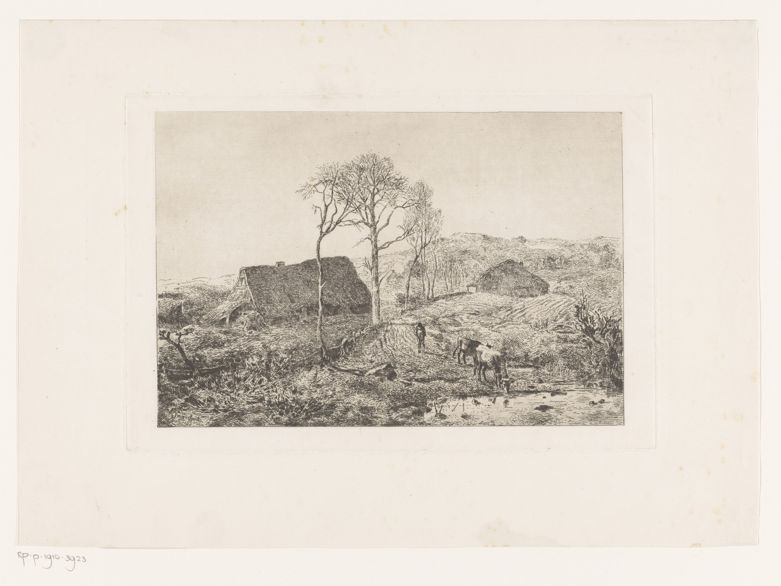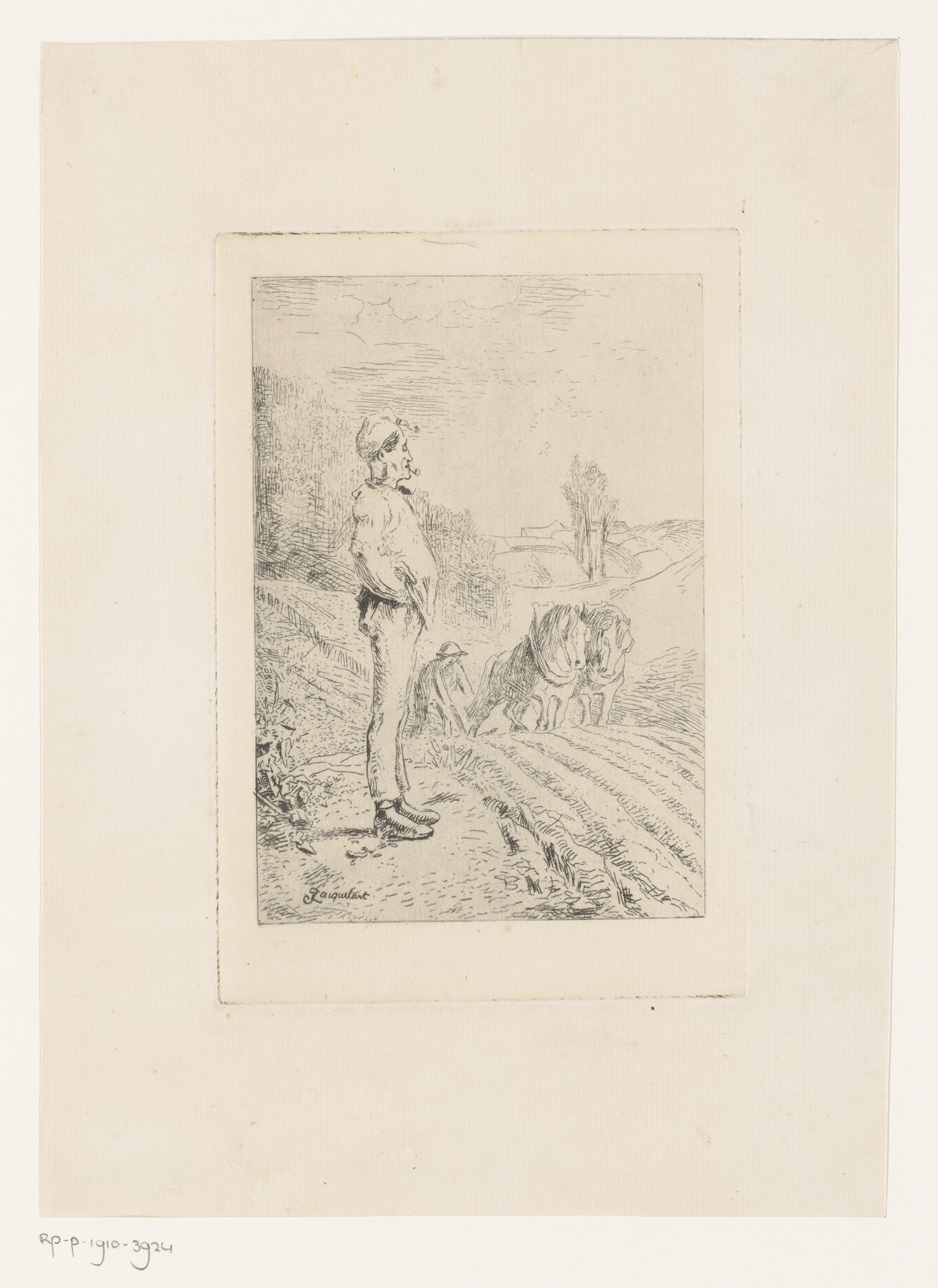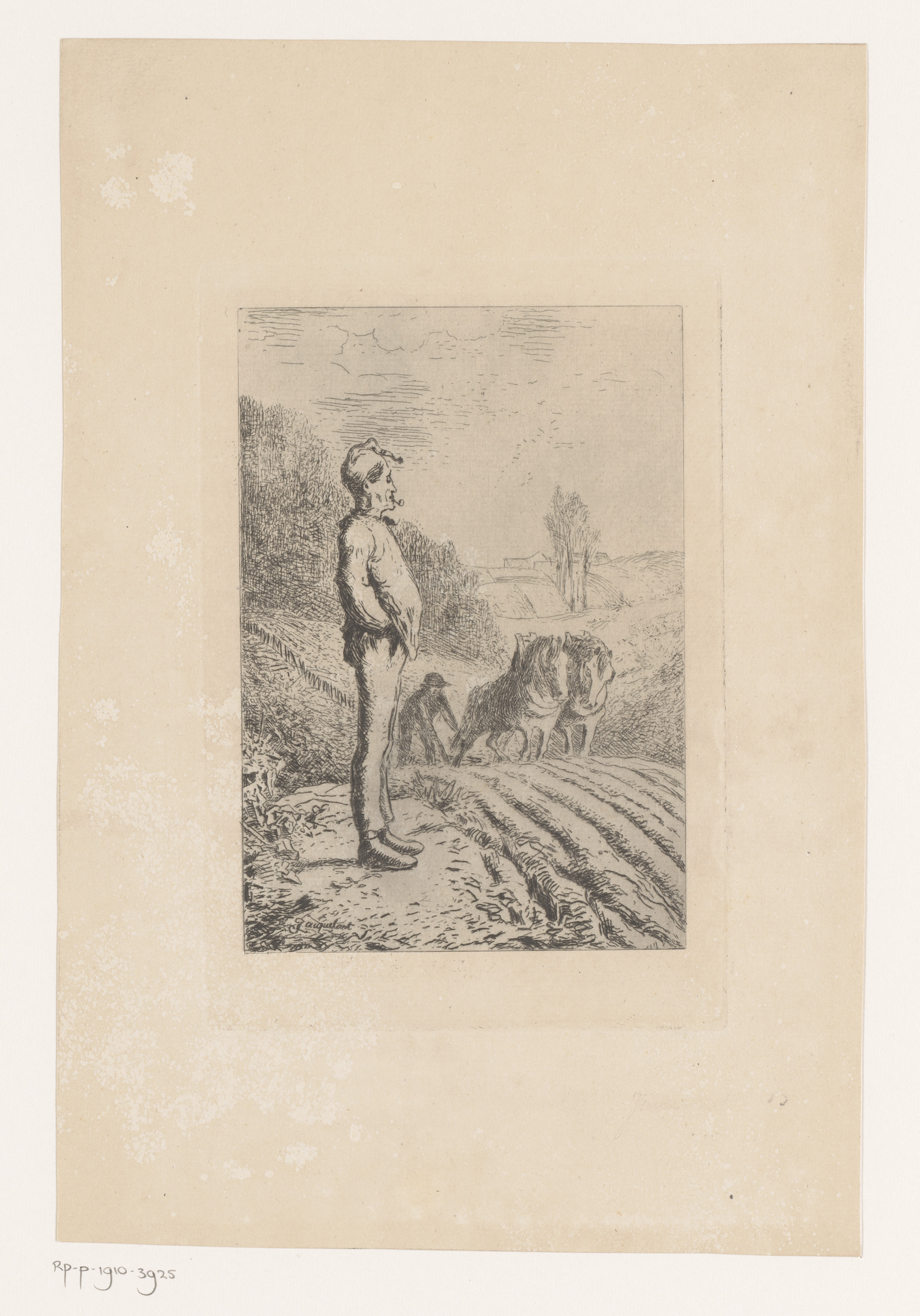 Man met pijp kijkt toe hoe een akker geploegd wordt ...